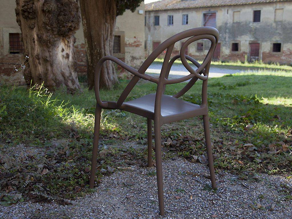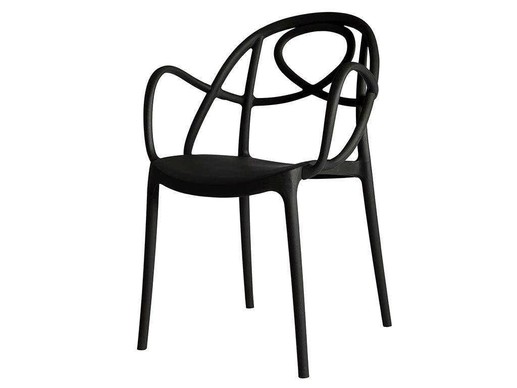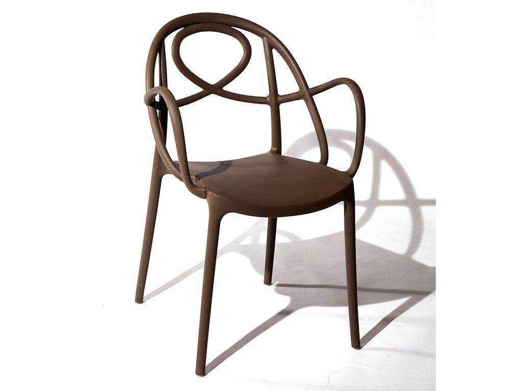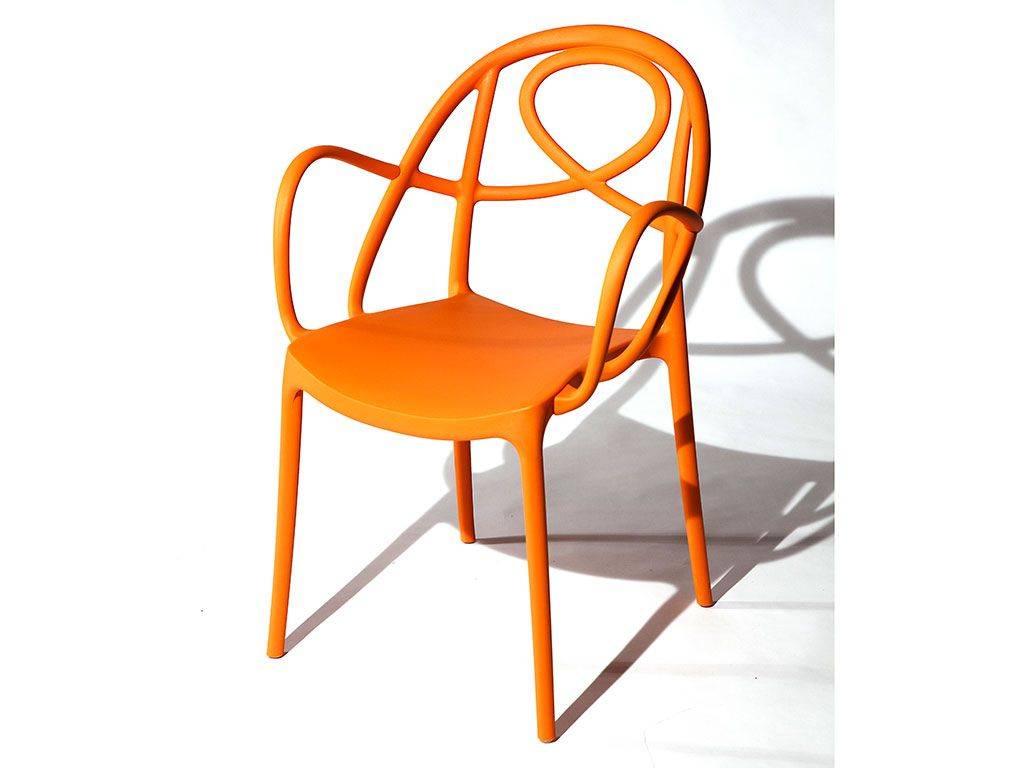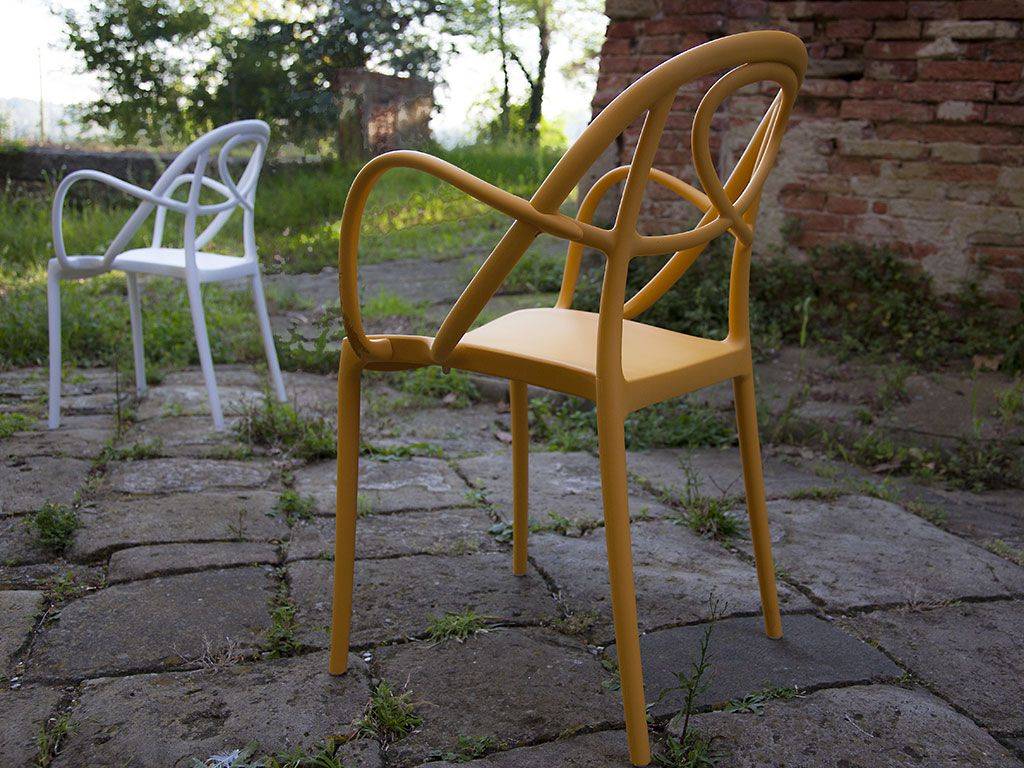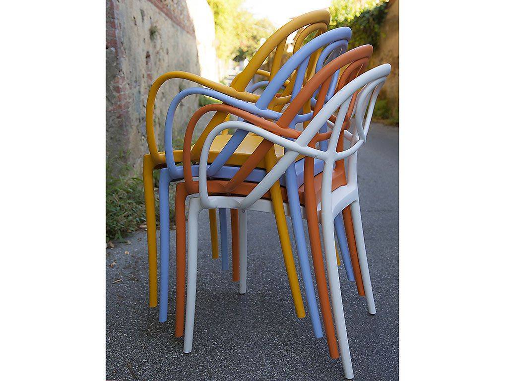 Poltroncina in polipropilene, leggera ed impilabile, disponibile in una moderna gamma di colori, esprime una personalità accentuata.