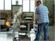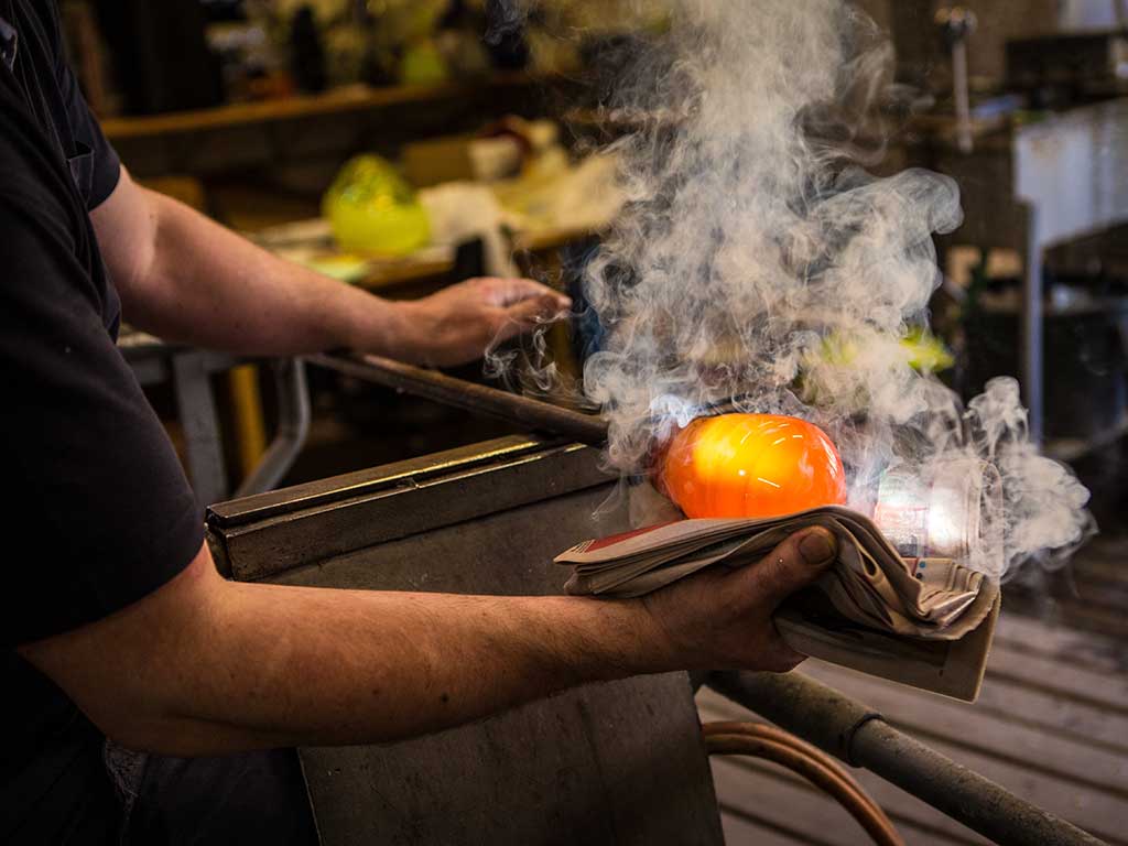 Le verre, soufflé par le maître verrier à l’intérieur de la monture en acier inoxydable, se gonfle en se façonnant jusqu’à prendre la forme souhaitée.