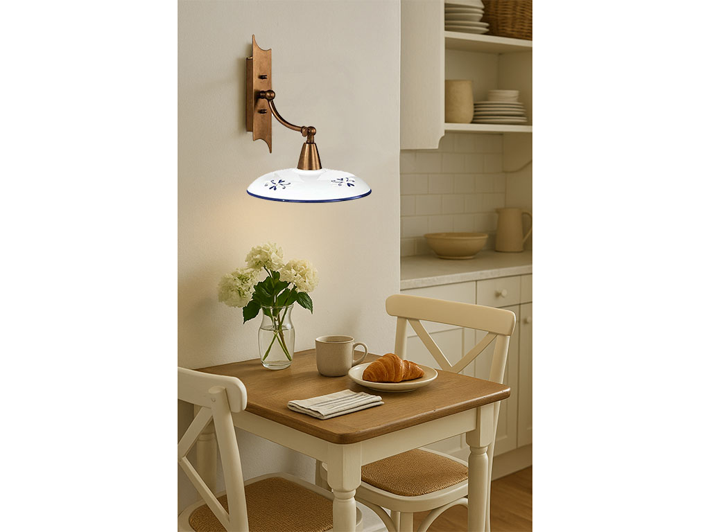 Applique en céramique rustique, applique en céramique décorée, lampe murale avec bras en laiton, idéale comme applique murale classique. Ligne de lampes pour intérieur avec structure en laiton, finition bruni et abat-jour en céramique décorée. Lampes de haute qualité avec des finitions qui durent dans le temps, particulièrement indiquées pour les villas, les maisons en bord de mer ou les élégantes demeures historiques. Chaque article est réalisé avec soin et passion, il est mis en valeur par de petits traits distinctifs, caractéristiques typiques désormais exclusives du savoir-faire artisanal. Dimension: Ø 22 x L 25 x H 28 cm max 60W E14 IP20 220-240V (ampoule non inclue) Couleurs et Finitions: BR - Bruni Abat-jour céramique decorée: BL – bleu brillant MA – marron brillant VE – vert blanc brillant Le vieillissement de ces produits est fait à la main donc la tonalité du laiton pourrait avoir des nuances différentes de celles représentées en photographie. Ces produits sont fabriqués à la main avec des matériaux traditionnels et de qualité comme le laiton, savamment créés à la main pour obtenir de petits et grands jeux de lumière au design unique et de haute qualité avec des finitions qui durent dans le temps. Verres, soufflés par des maîtres artisans selon des techniques de travail antiques. D'éventuelles imperfections mineures doivent être considérées comme des qualités et des traits distinctifs de l'ouvraison recherchée et non comme des défauts de fabrication. Produit fabriqué en Italie