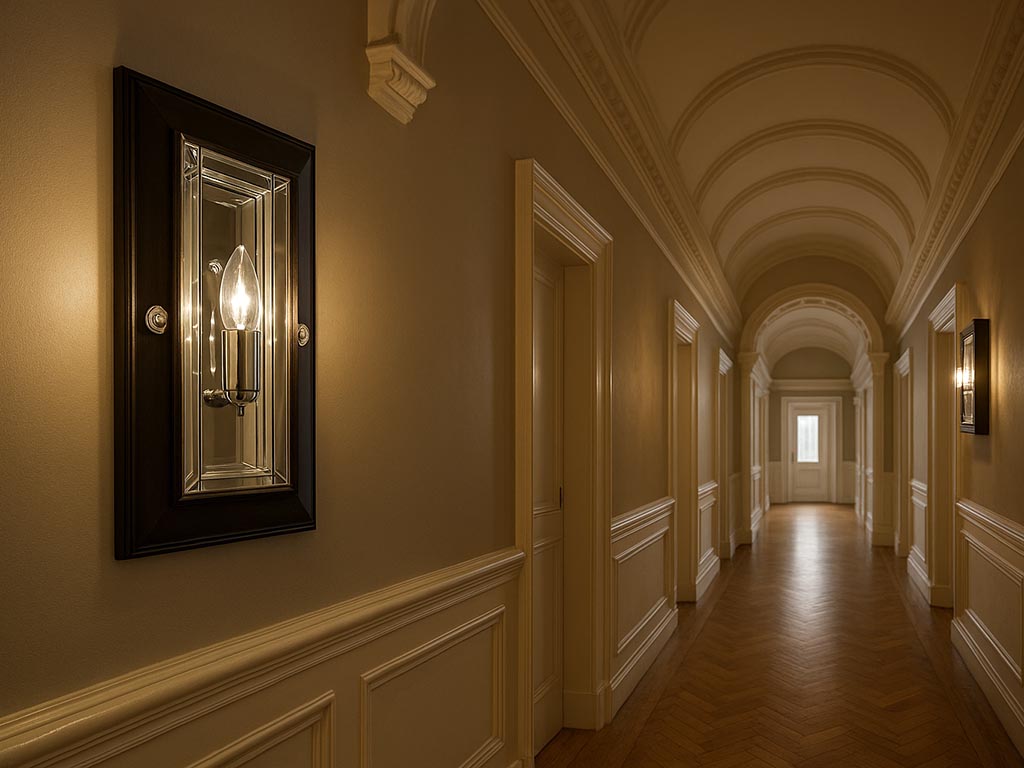 Applique élégante et classique en laiton, avec cadre en bois et verre moulé, idéale comme applique murale de salon, d'entrée ou de chambre à coucher....