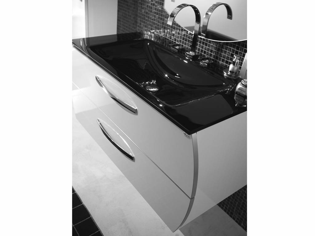 Arca 02 meuble déco de salle de bain - Meuble à suspension avec structure en mélamine de 18 mm. Il revêtu en laminé avec cadre en aluminium. La finiture est en blanc brillant. Le Top technique est en Mineral marbre blanc brillant. Le miroir est à fil brillant, les poignées et la lampe ont des finitures chromées.