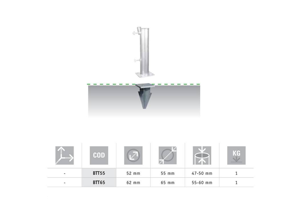 Tube en acier à placer au sol en 2 dimensions:Ø interne 52mm pour pied de parasol de 47-50mm.Ø interne 62mm pour pied de parasol de 55-60mm.