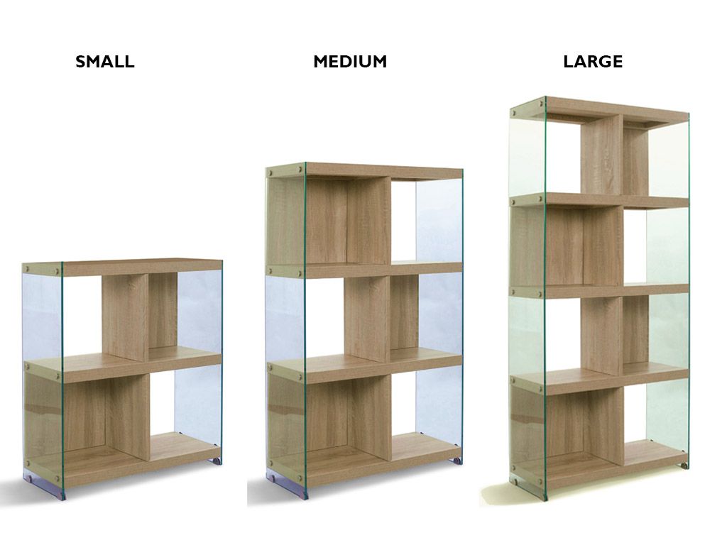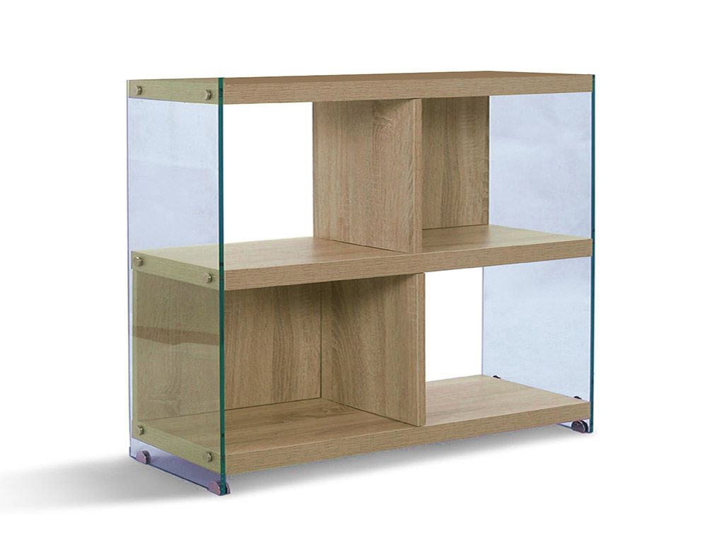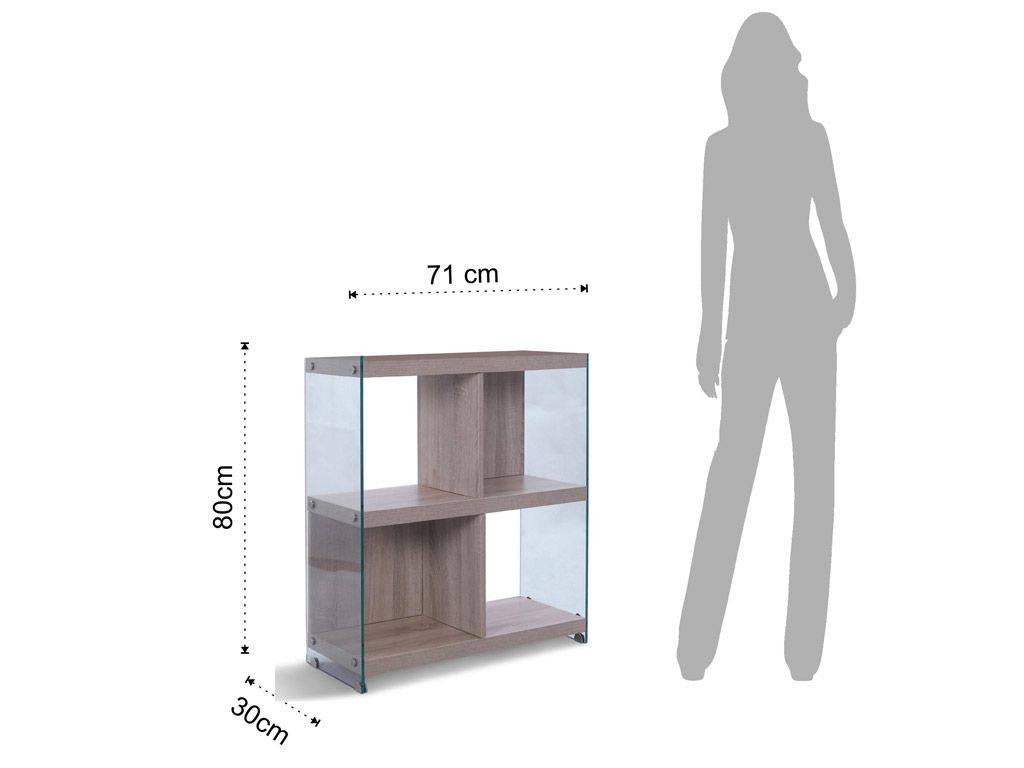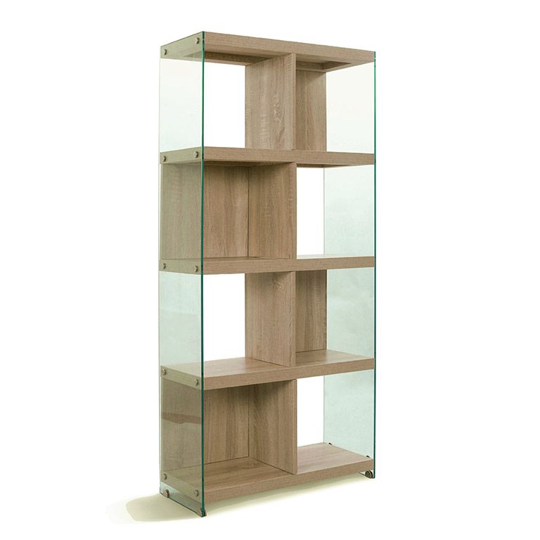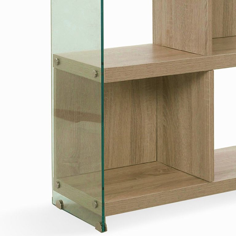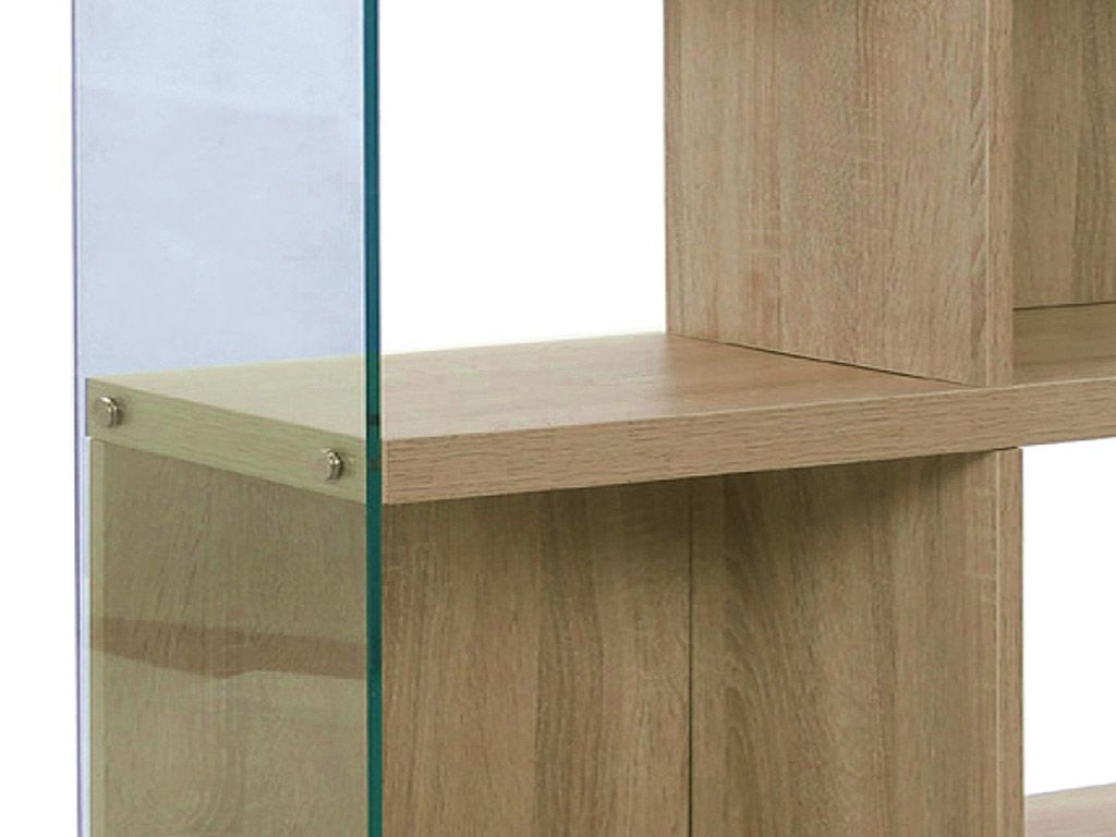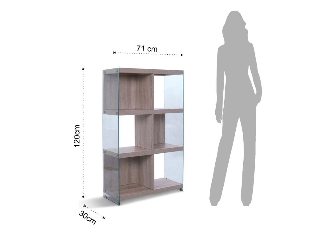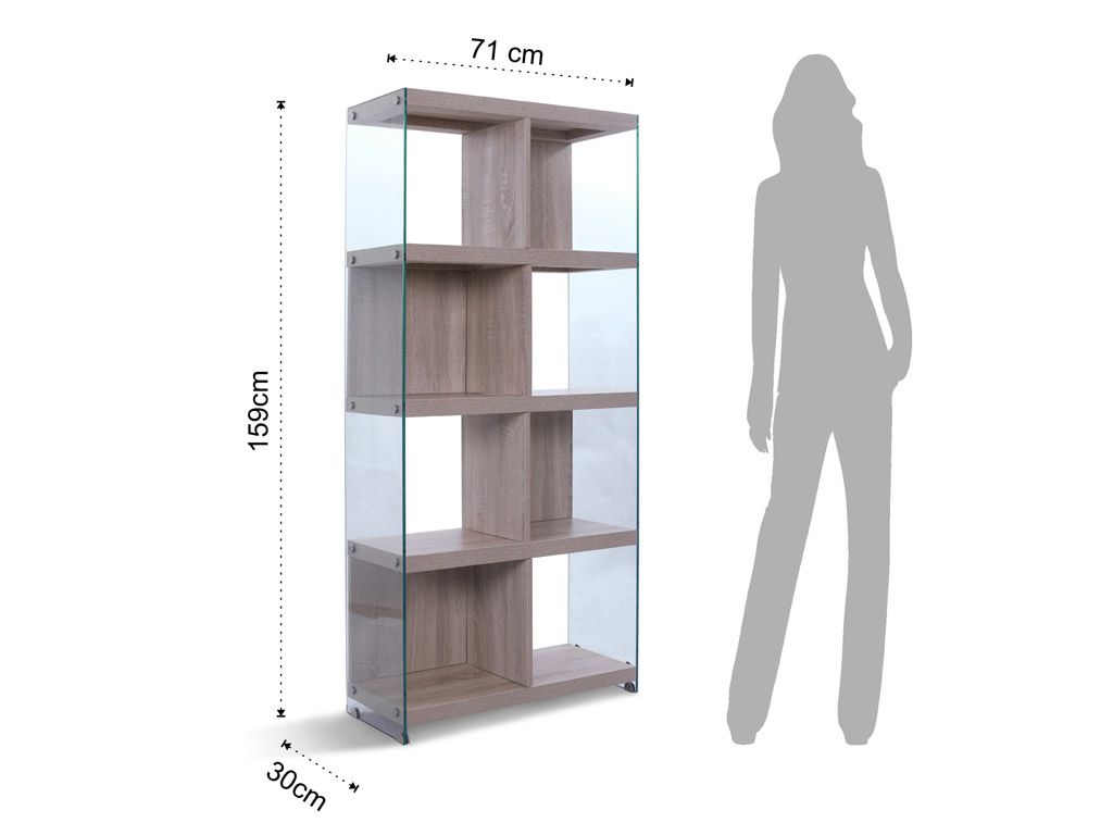 Bibliothèque avec coté en verre transparent trempé, épaisseur 8 mm.Les étagères et les cloisons, revêtus en mélaminé avec finition chêne, sont réalisés avec panneaux écologiques des parcelles en bois et MDF, épaisseur 8 mm. Le dossier est réalisé en MDF, épaisseur 8 mm, et revêtus en mélaminé avec finition chêne.