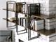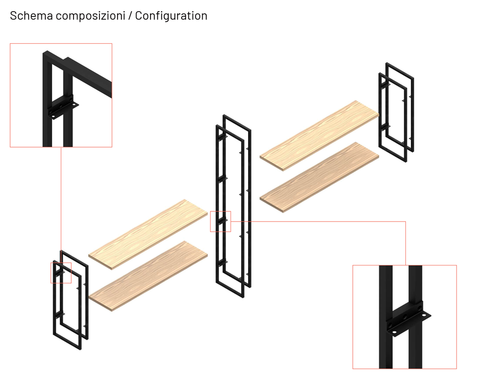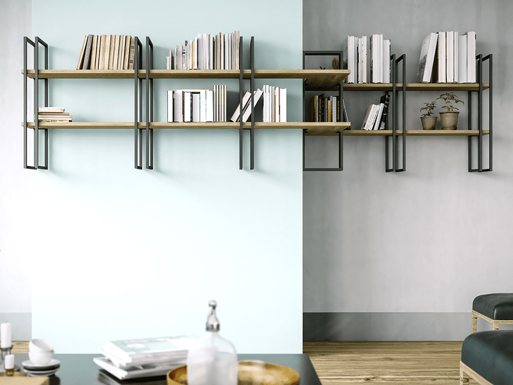 Les cadres en métal, fixés aux murs, soutiennent les étagères en bois conformément à les hauteurs customisées (alignées ou décalées).