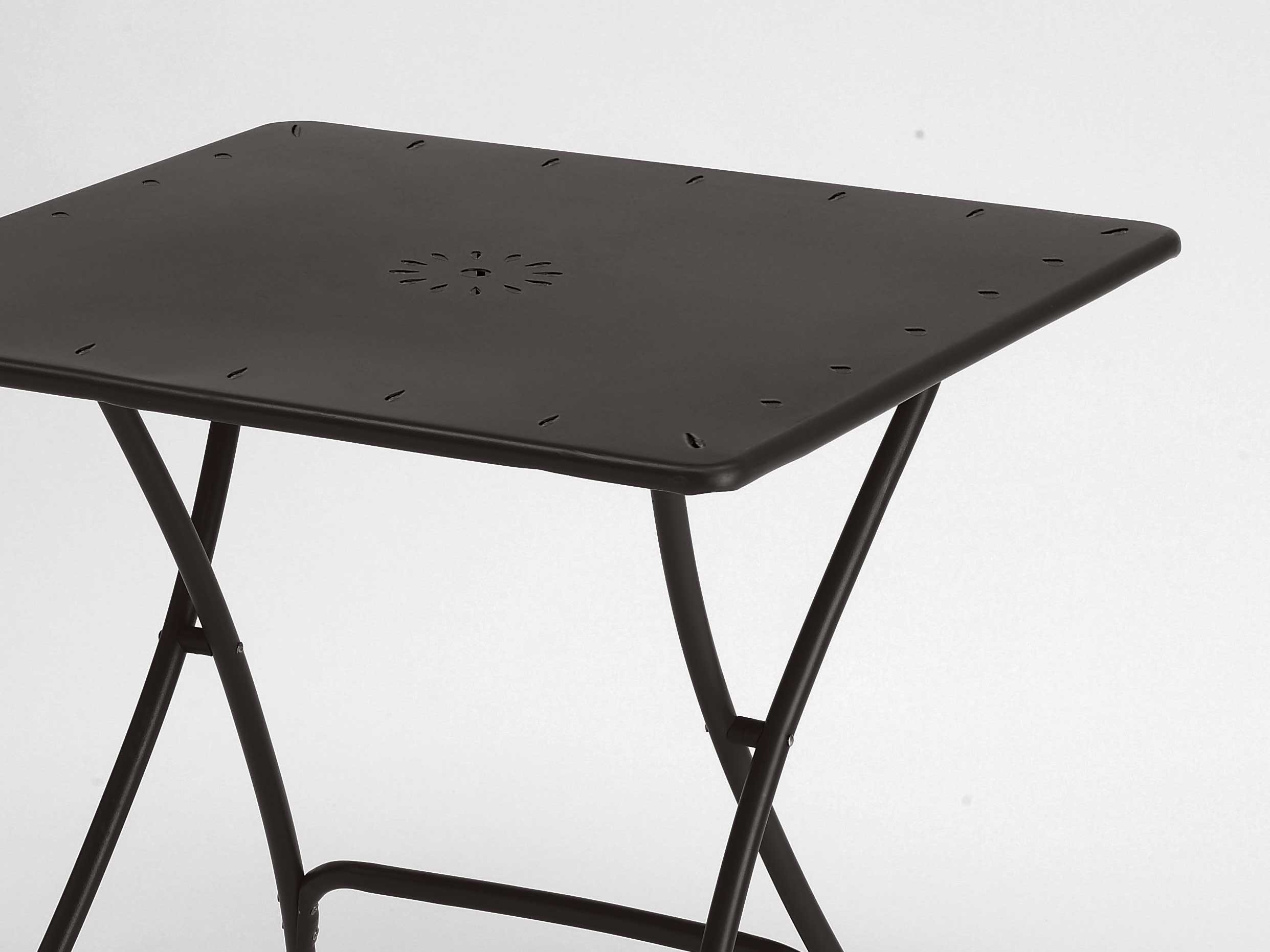 Plan: plaque de tôle ornée.Pieds: tubulaires en acier.Repliable.