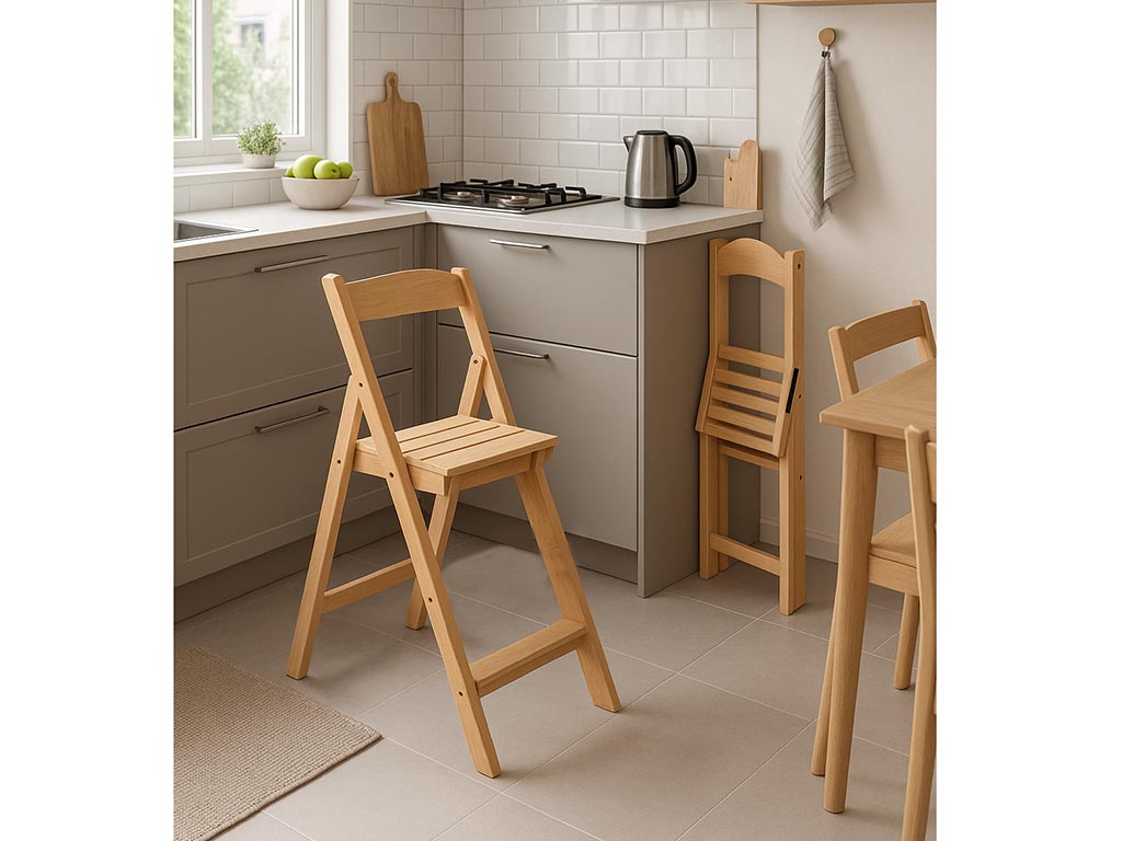 Chaise pliante Scala, chaise à échelle, échelle pliante, chaise en bois pliante, chaise peu encombrante. Scala est une chaise pliante réalisée en hêtre massif ; elle est pratique versatile et très peu encombrante qui se transforme en une échelle. Le dossier moulé est confortable et il offre un point d’appui dans l’utilisation de la chaise comme échelle.