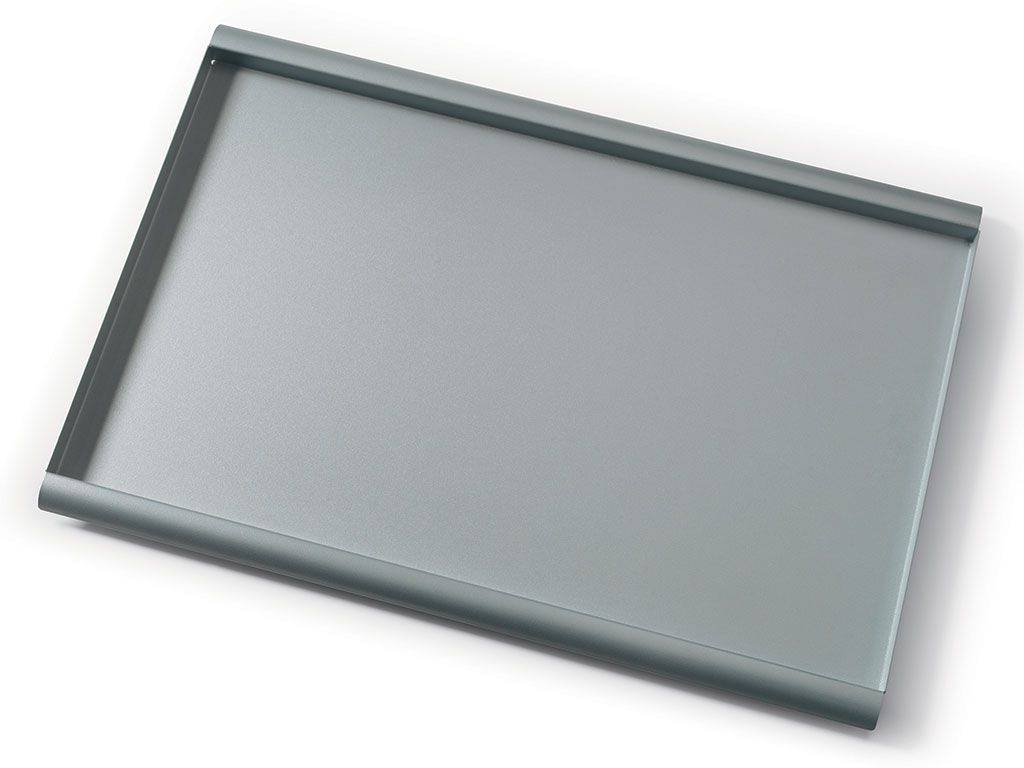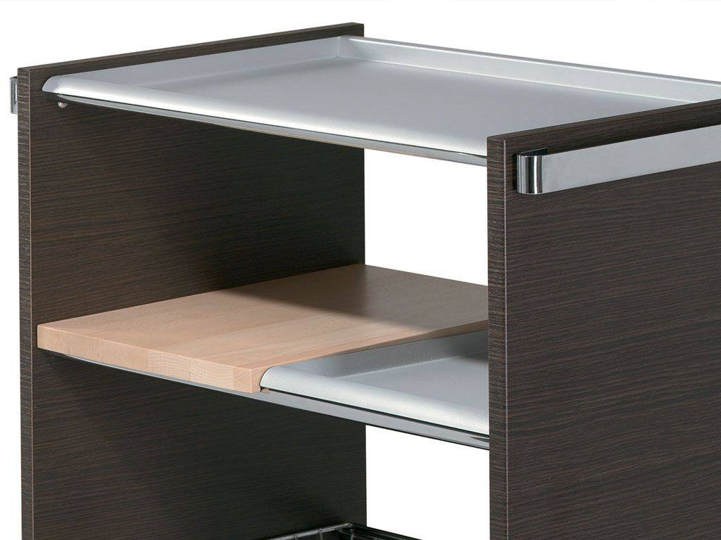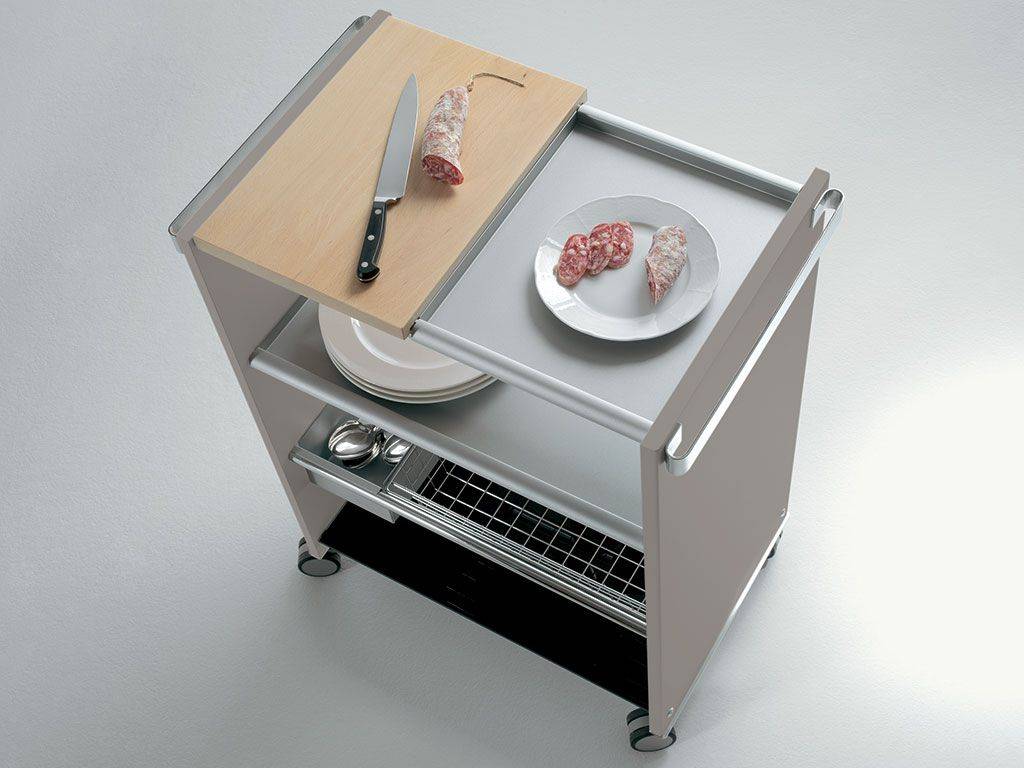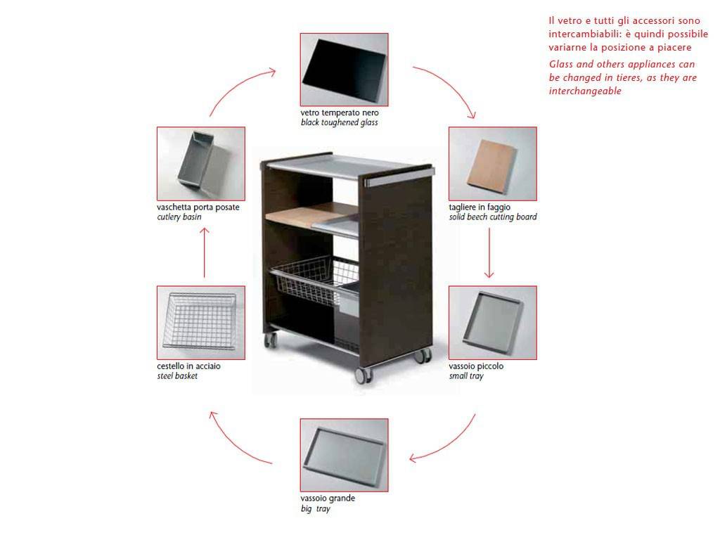 Table roulante multifonctions. Structure en laminé 18 mm. combiné avec acier et verre trempé. Elle est équipée de nombreuses accesoires amovibles et interchangeables en acier: petit plateau, grande plateau, bassinet, planche à découper en bois massif d'hêtre et panier en acier chromé.