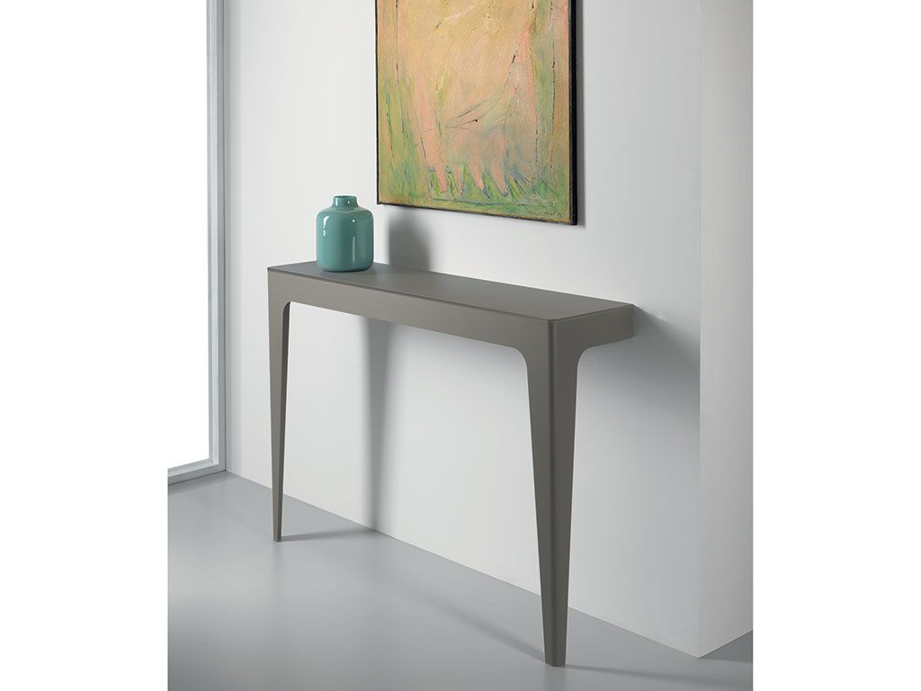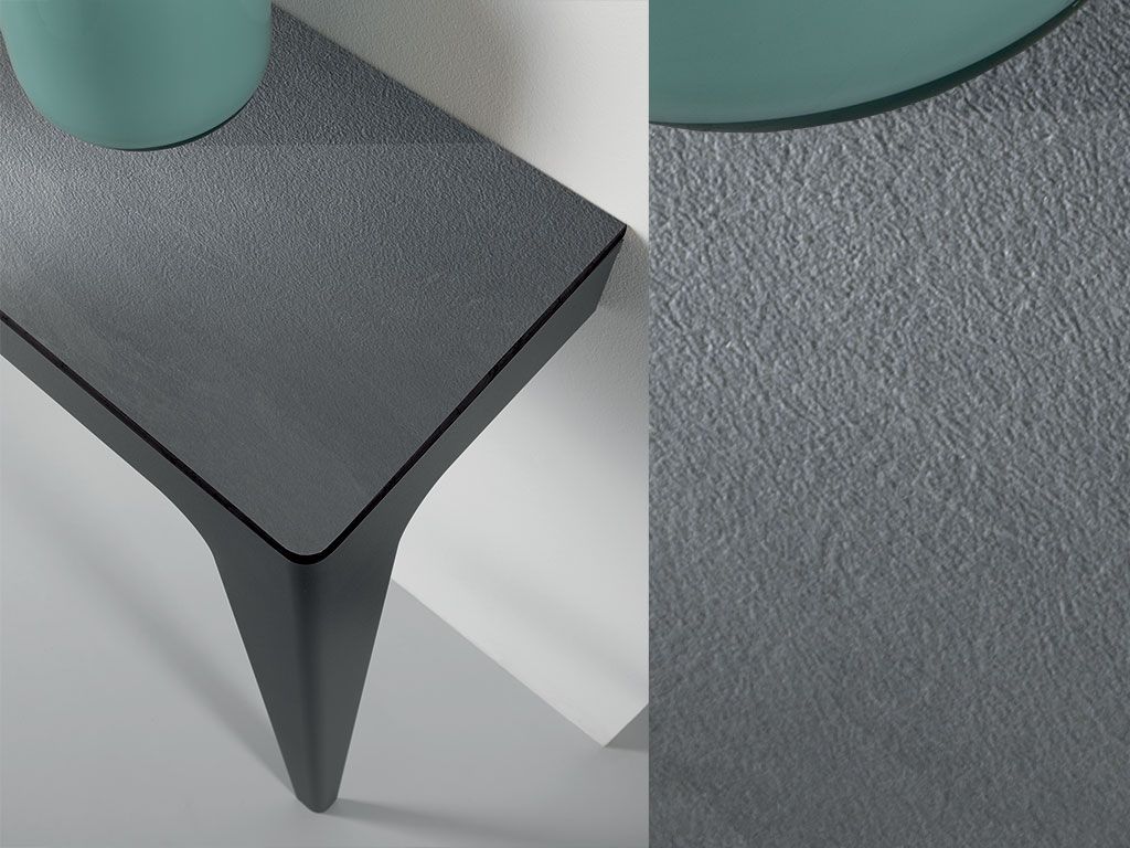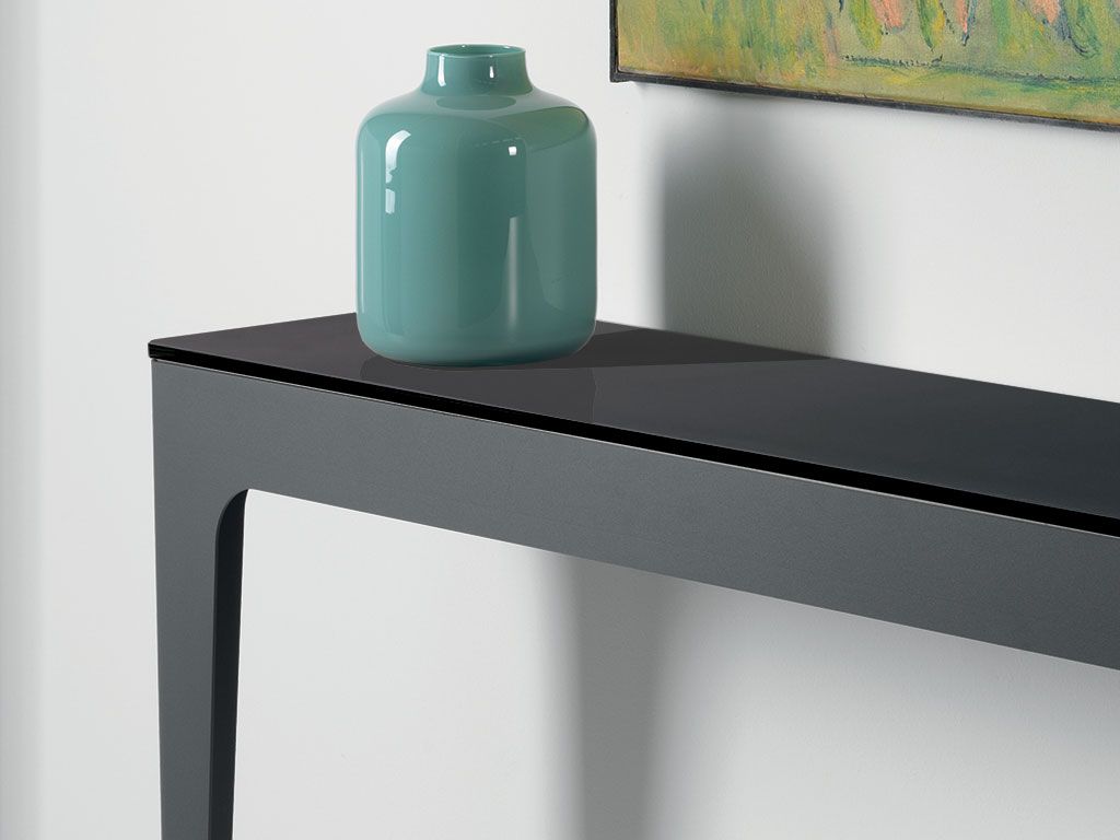 Console fixe, avec structure réalisée en acier vernis avec finitions sablé, enrichie par un top à choix entre le verre gravé vernis à l'arrière et comptoir en HPL+VERRE.