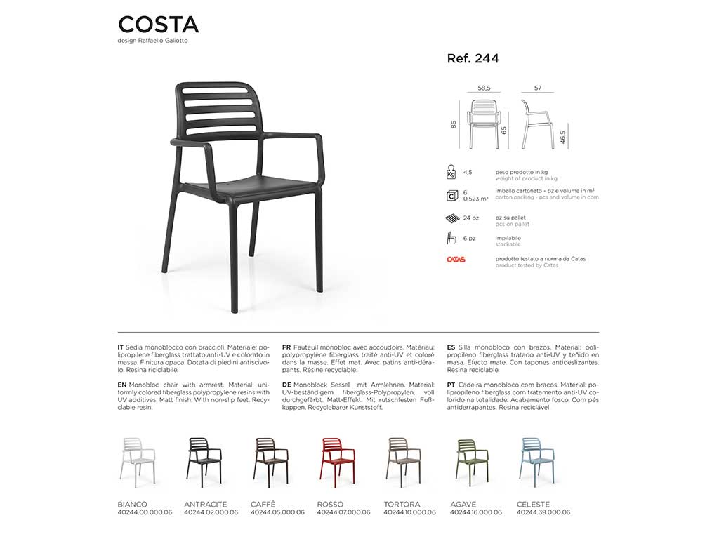 Assise monobloc et impilable avec bras, en résine de première qualité avec fibre verre (polypropylène fiber-glass traité anti-uv et coloré en masse), fourni des pieds antidérapants. Finition OPACA