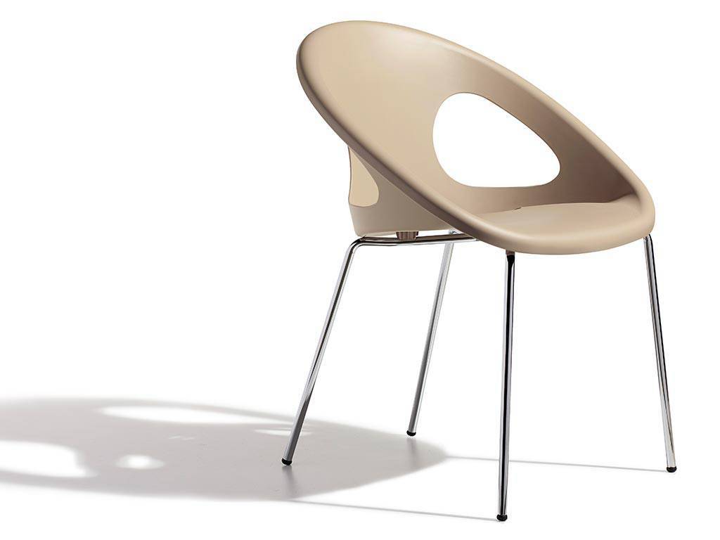 Fauteuils design, fauteuils moderne, fauteuils cuisine idéal comme fauteuils de salon ou fauteuils de chambre. Coque en technopolymère recyclable. Structure à 4 pieds en tuyau d'acier ø mm 16 chromé. Pour usage interne. Empilable.
