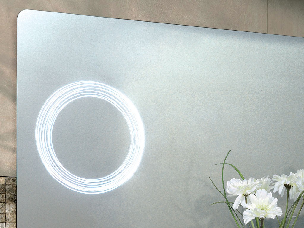 Miroir éclairé à LED avec angles arrondis bord poli, avec sablage fils superposés.Structure/Cadre en acier INOX. Reversible.