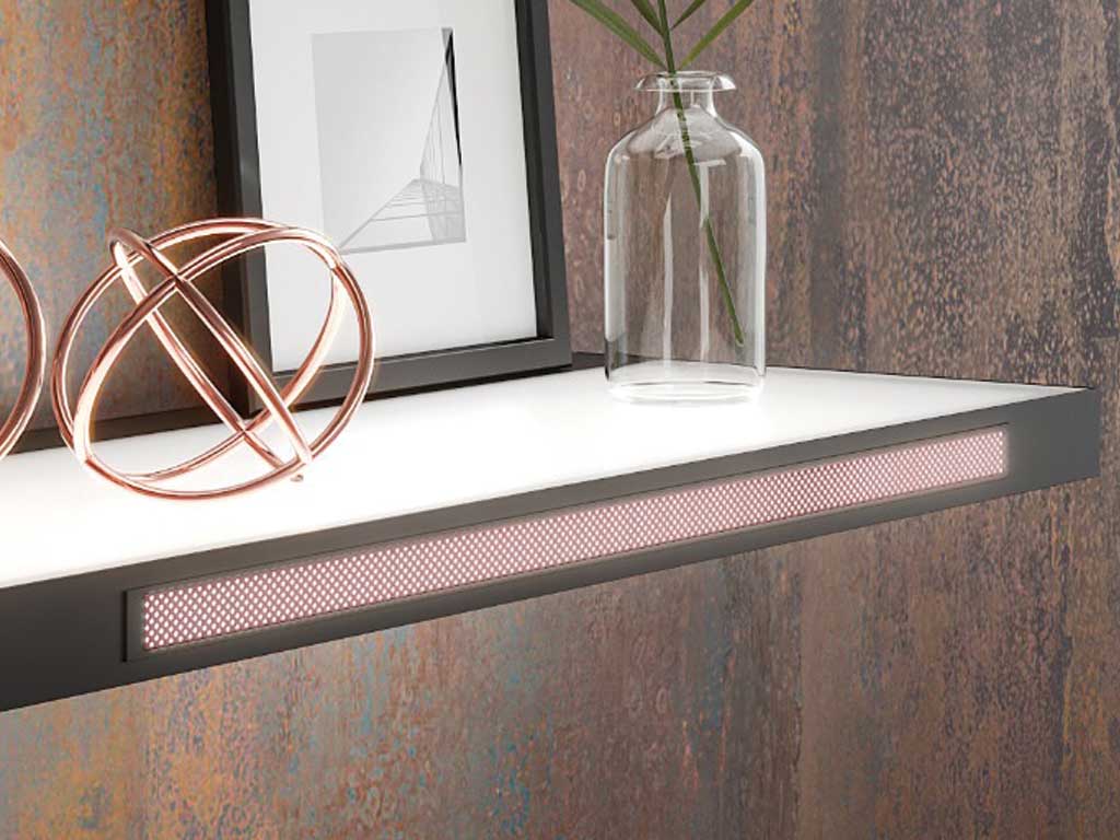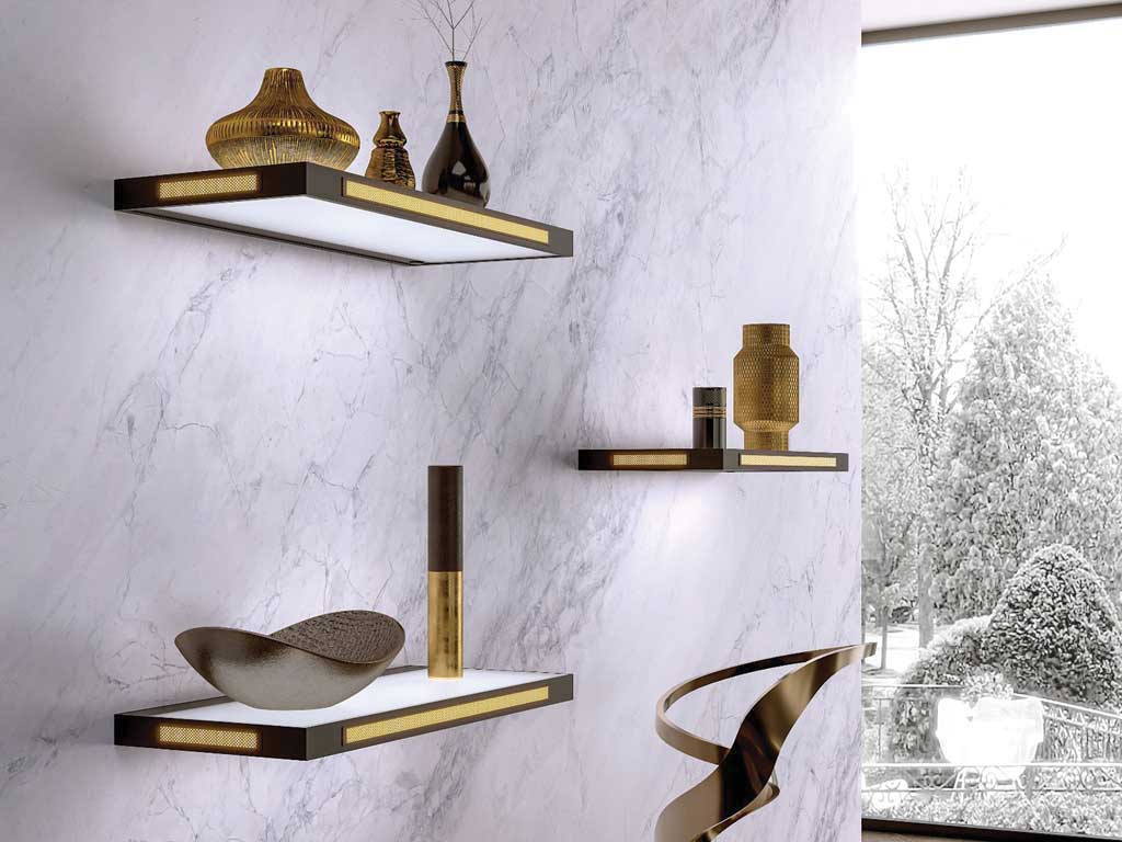 Étagère design avec application de maille ajourée éclairée, positionné frontalement et latéralement, disponible dans les couleurs Cuivre, Or et Noir.