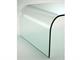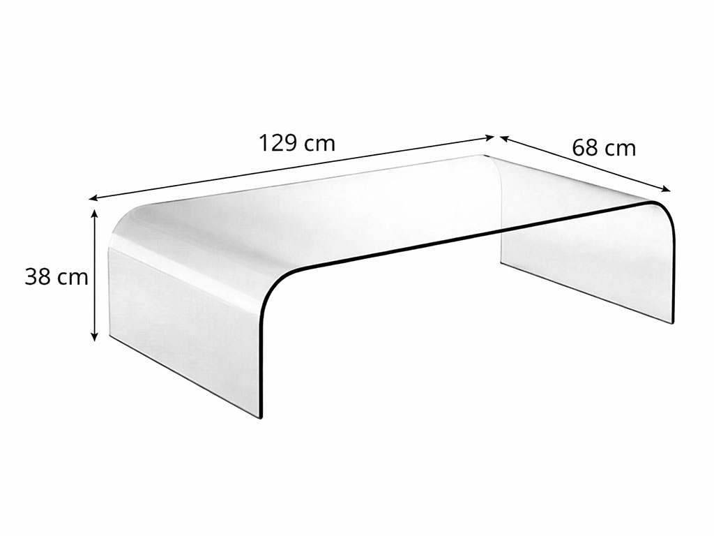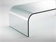 Cette table basse en verre a une forme rectangulaire, avec du verre courbé.
