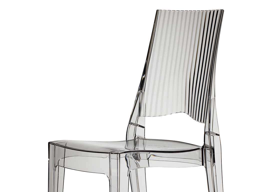 Structure en polycarbonate. Design classique et matériaux modernes. Elle est projeté pour être comfortable et accueillante, le dossier a des lignes qui s'allongent vers l'haute.