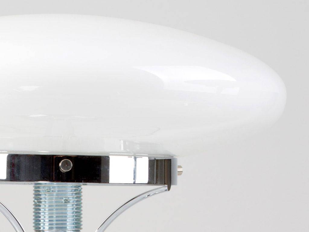Lampe de table. Base en laiton fondu. Diffuseur en éléments en laiton calandrés et soudés. Diffuseur en verre soufflé sur moule en bois, blanc laiteux.