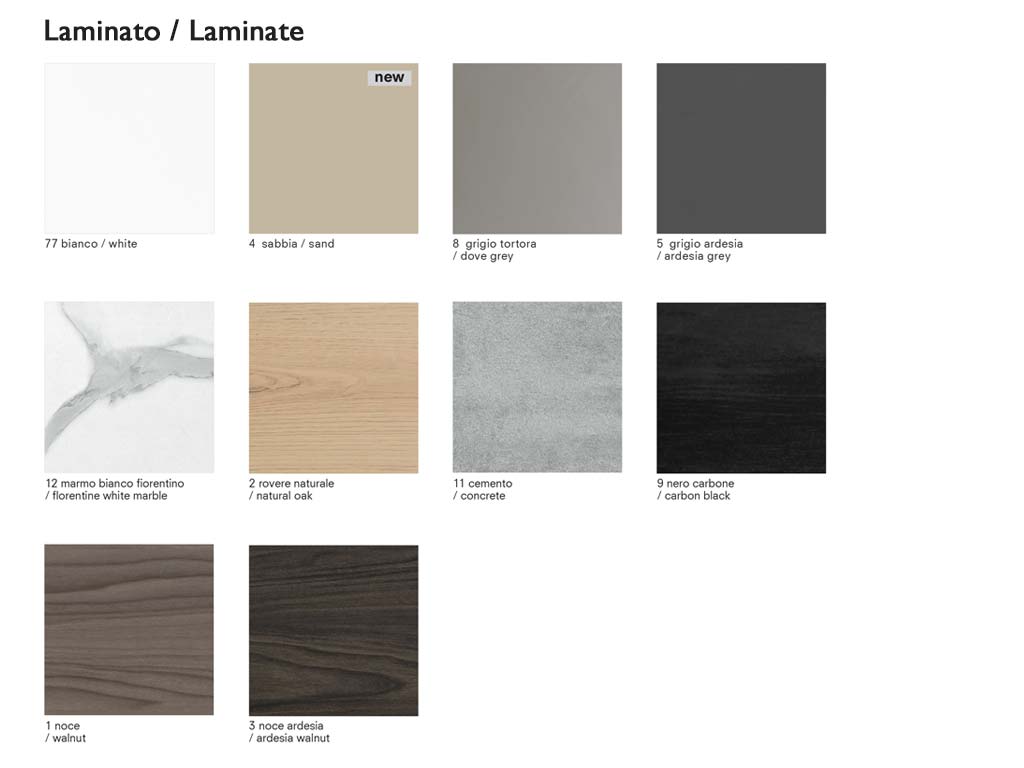Blanc opaque, Gris tourterelle, Gris Ardoise, Noyer, Sable, Marbre blanc, Noyer Ardoise, Ciment, Charbon Noir, Chêne naturel.