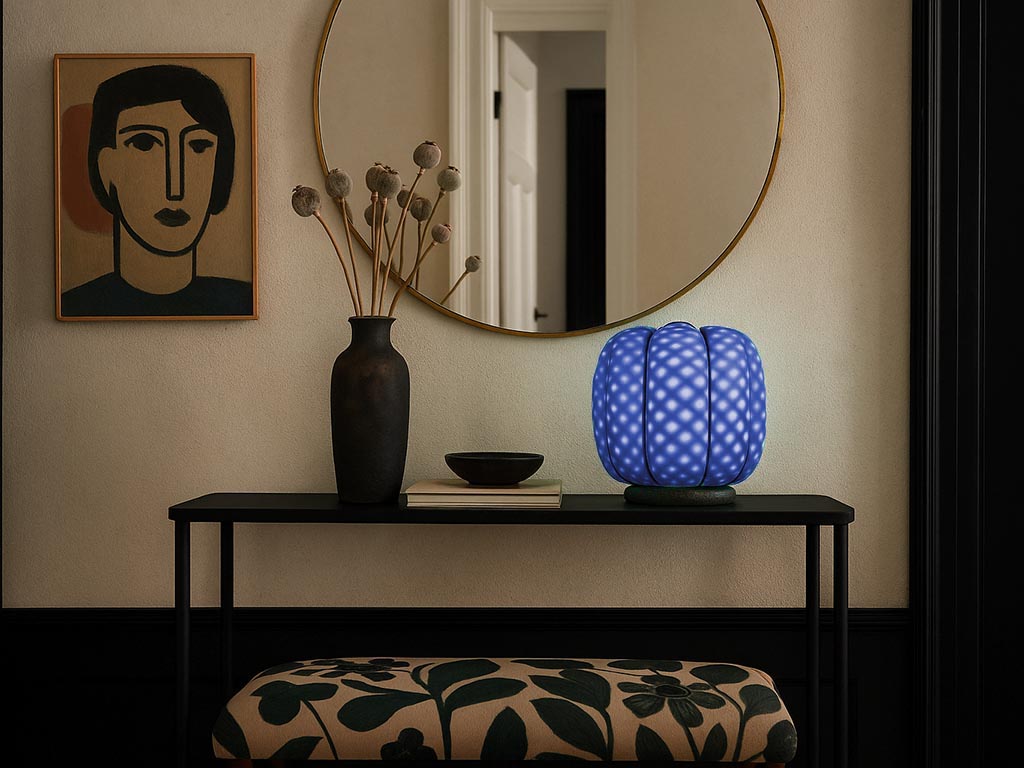Un objet d'ameublement particulier. Lorsqu'elle est éteinte, elle enrichit la maison de son design dans l'inimitable couleur blanc laiteux, mais lorsqu'elle est allumée, elle s'illumine grâce aux couleurs vives dissimulées dans le verre à l'intérieur, en donnant de la verve et du volume à n'importe quelle pièce.