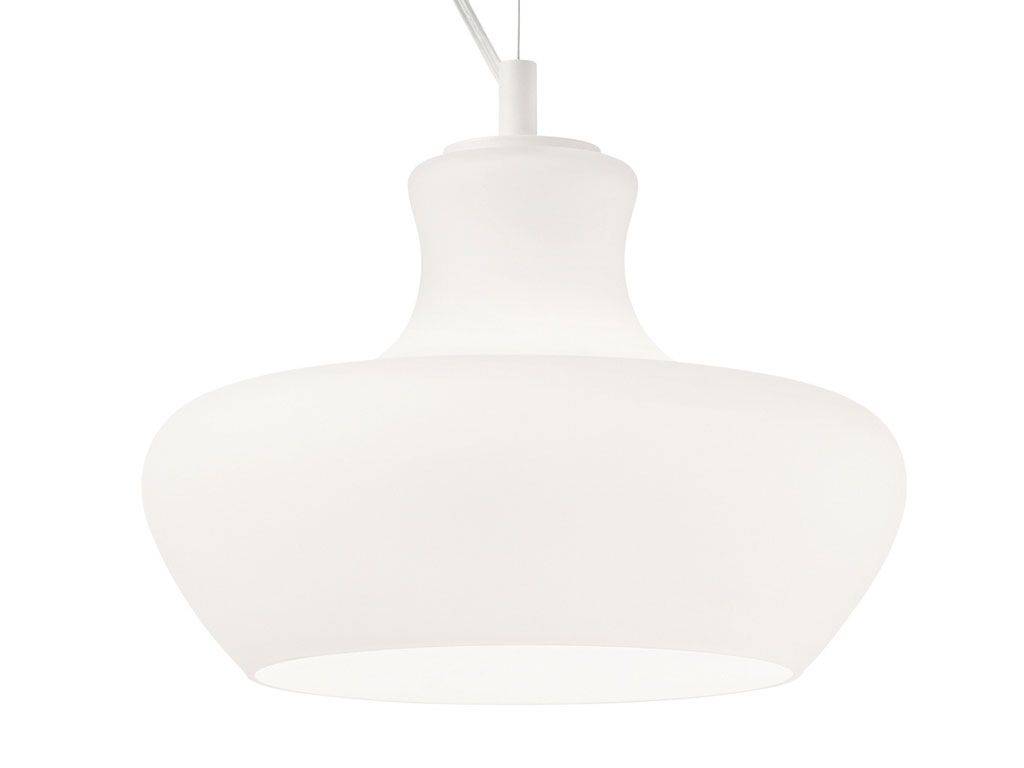 Aladino, lampe à suspension avec une monture en métal émaillé blanc satin. Diffuseur en verre soufflé enchemisé.Câbles en acier à longueur réglable par des dispositifs automatiques.Le produit est parfait pour les espaces intérieurs.