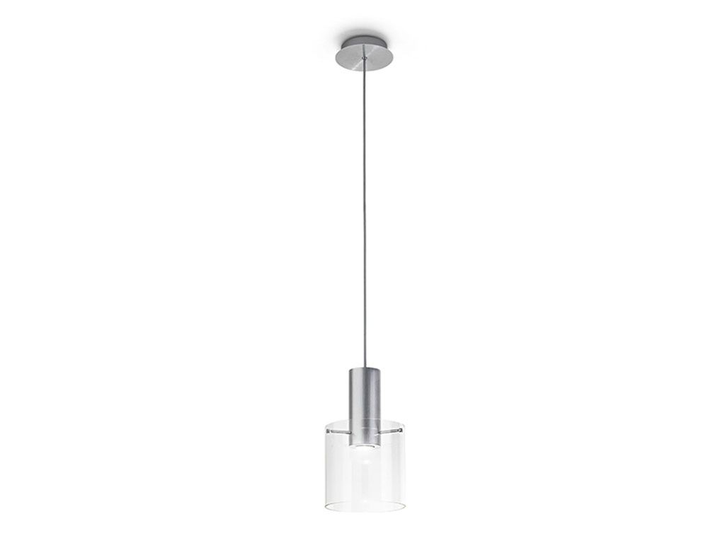 Lampe à suspension composée par l’union de deux cylindres d'amplitudes différentes. Lampe en aluminium avec finition d’or brossé et verre disponible en plusieurs finitions.