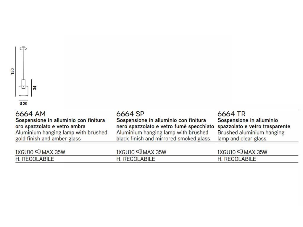 TAILLE:6664 AM Verre ambreØ20 X 34 X H.REG.150 CM 1XGU10 MAX 35W6664 SP verre fumè à effet miroirØ20 X 34 X H.REG.150 CM 1XGU10 MAX 35W