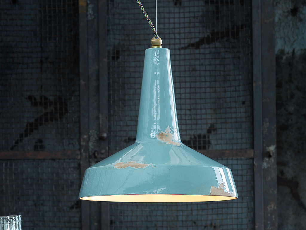 Lampe à suspension, lampe vintage, lampe design, idéale comme lampe à suspension pour vintage cuisine ou lampe à suspension vintage. Lampe à suspension vintage en céramique aux couleurs vintage, sa ligne s’inspire de l’esthétique industrielle du 20ème siècle. Le style rétro et amtique est obtenu à travers des surfaces recouvertes d’émaux par l’effet sablé, qui donnent un aspect matériel avec des nuances de couleur élégantes. Câble de coton multicolore. Pièces en métal laiton DIMENSIONS: Ø 35, H 43 cm - Kg 2,90 - 1 x MAX 53W E27 Longueur de câble électrique max 150 cm Longueur du câble en acier max 120 cm Ampoule exclue Idéal pour les maisons de caractère et de style ou pour les bars, restaurants et hôtels qui veulent créer une atmosphère unique. Produit artisanal réalisé en Italie