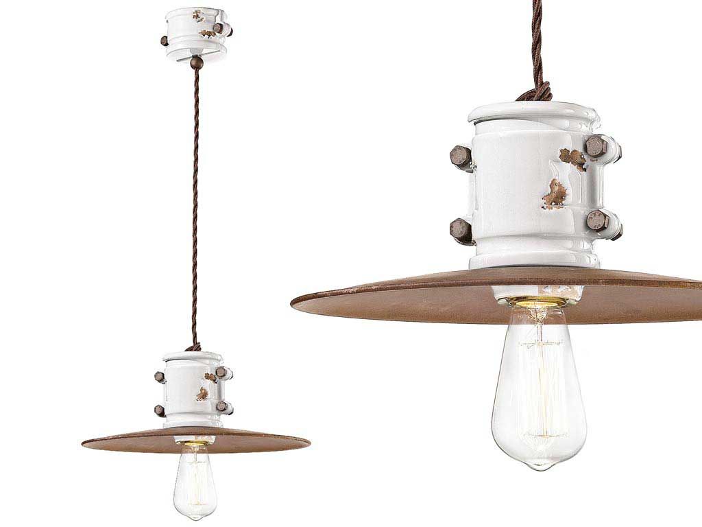 Lampe suspendue vintage, réalisé en céramique et en fer antique Corten, aux couleurs vintage. Le style rétro et antique est obtenu par des effets d’usure délibérément réalisés en utilisant des techniques artisanales et en prêtant attention aux plus petits détails.