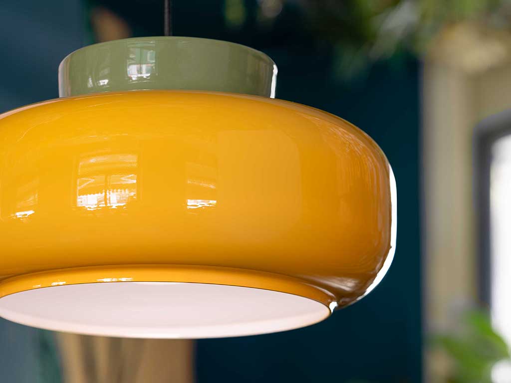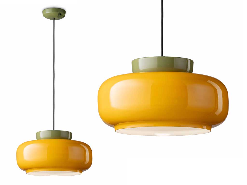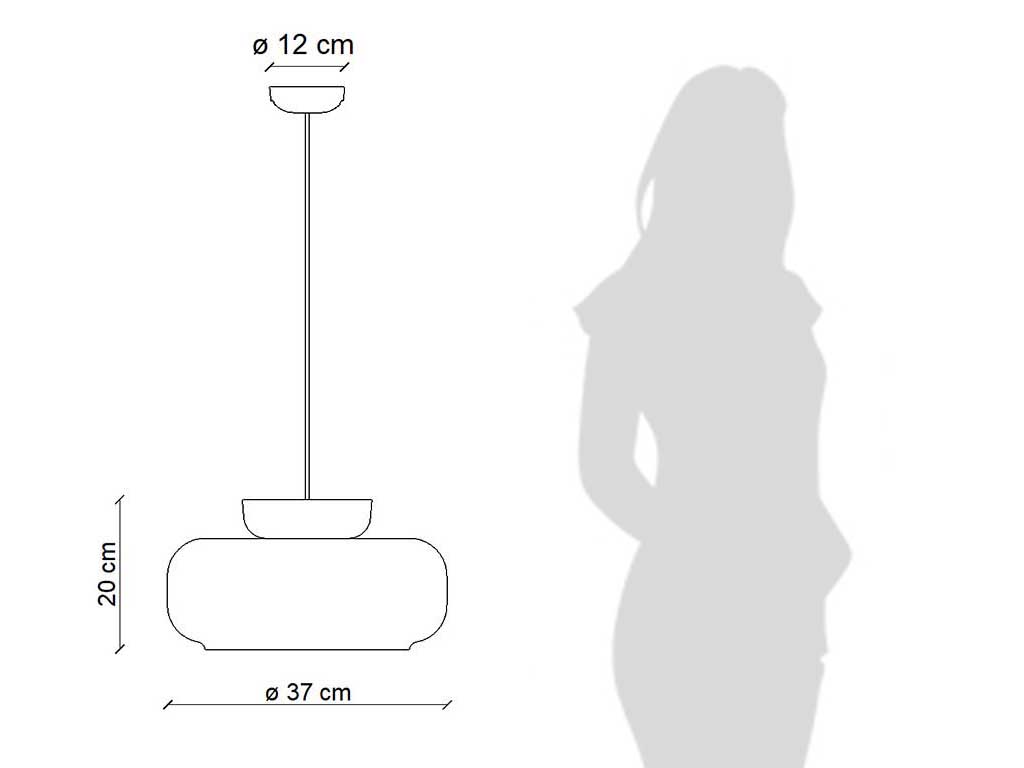 DIMENSIONS: Ø 37 cm H 20 cm - fixation au plafond Ø 12 cm Longueur de câble max 120 cm (câble de coton enduit). 1 x MAX 53W E27 - IP 20 - 220-240 V Classe énergétique A++ > D poids net Kg 2.90 Ampoule non incluse COULEURS: MOA = Moka et Orange SAG = Jaune et Vert