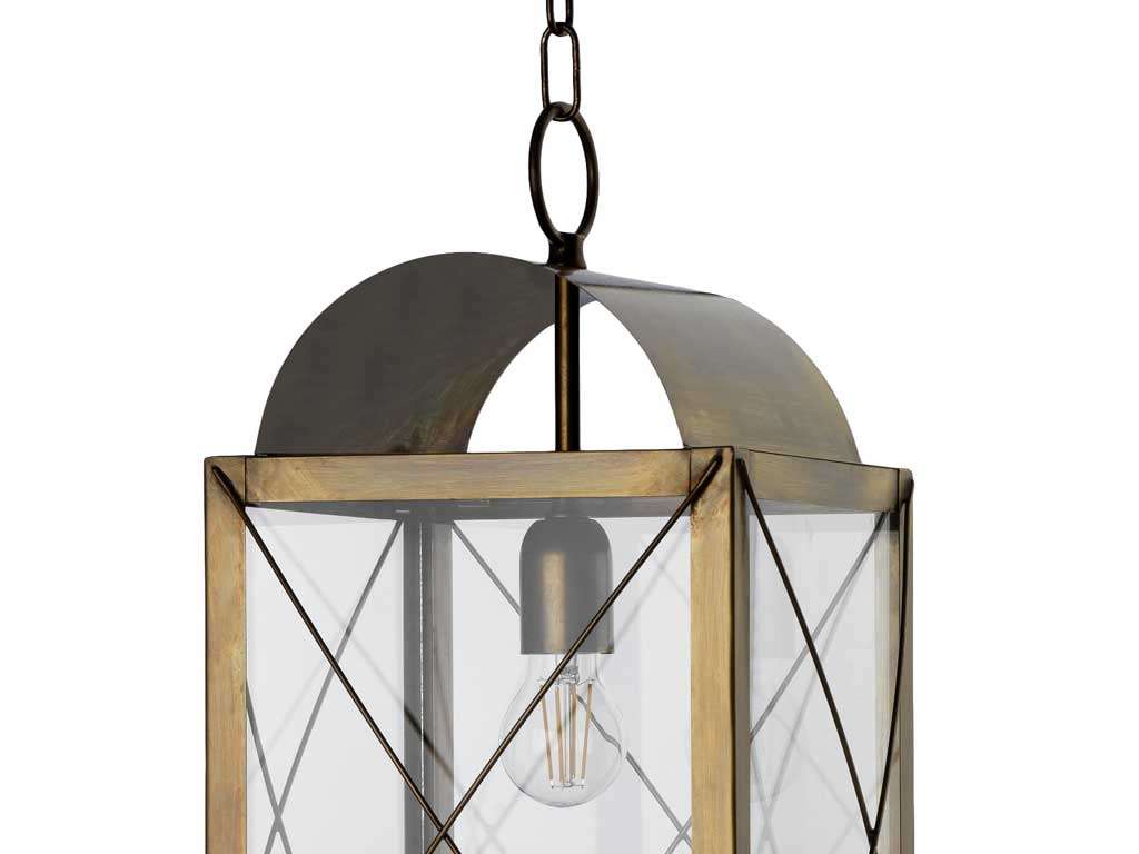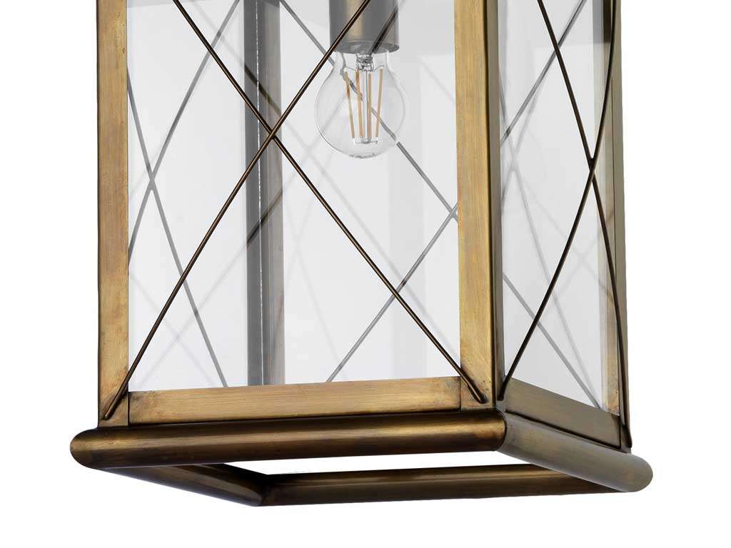 Lanterne à suspension, idéale comme lampe d’extérieur, avec verre transparent et cadre en bronze (photo), ou bronze foncé. Convient aussi bien comme lampe d’intérieur que comme lampe d’extérieur couverte.