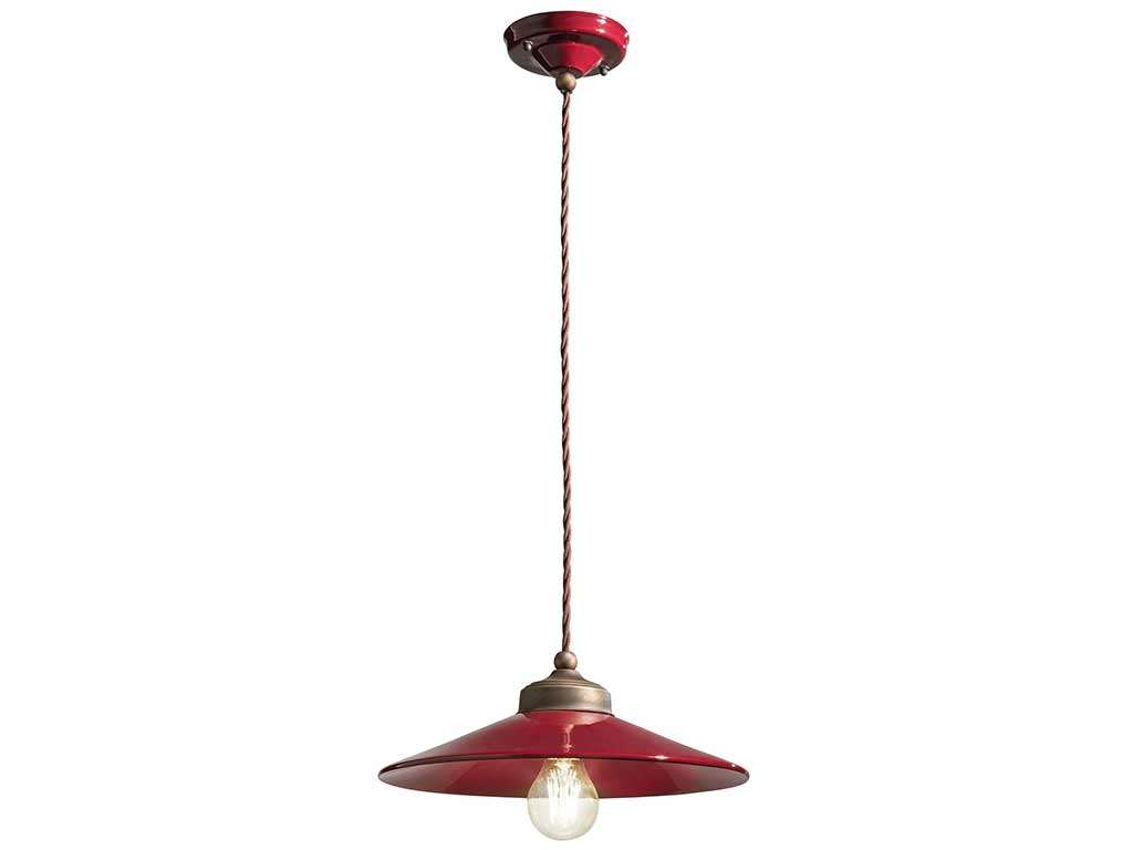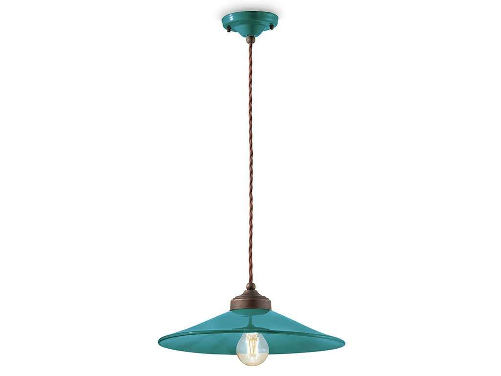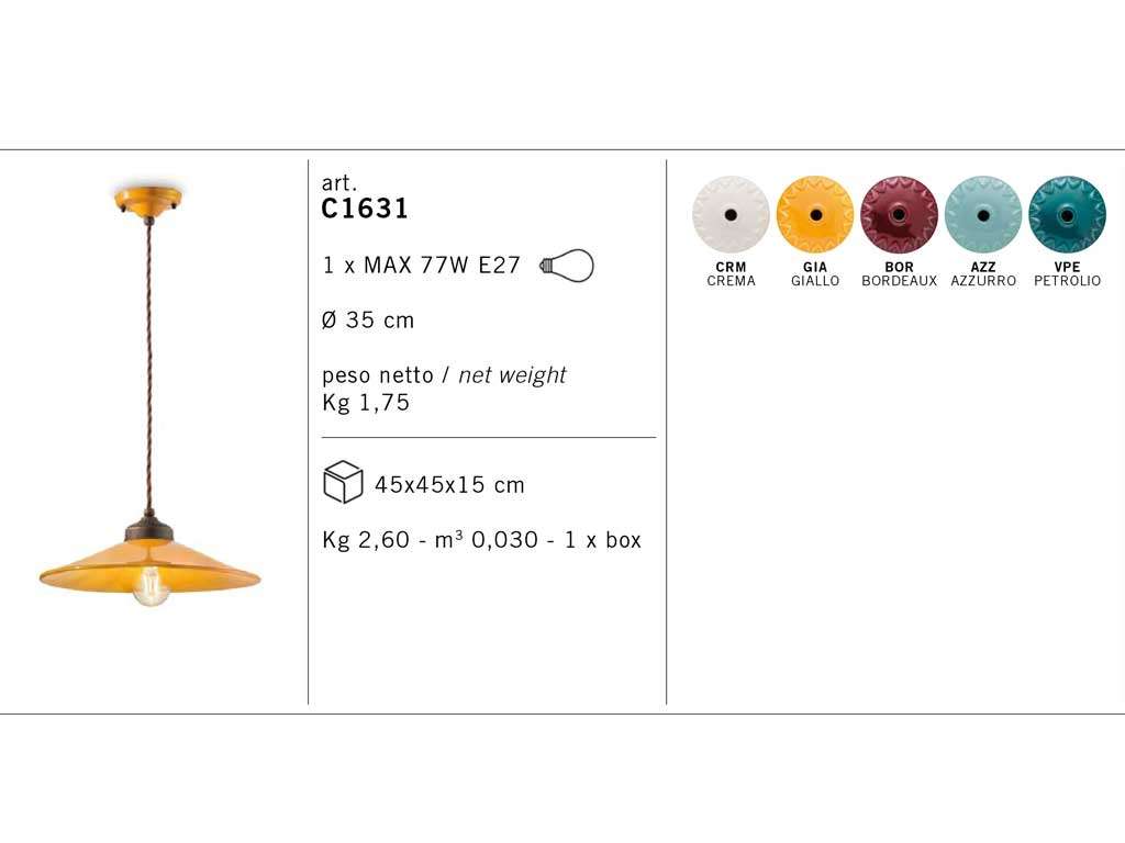 Lampe à suspension, lampe vintage, lampe à suspension colorée, lustre coloré, idéale comme lustre cuisine ou lustre moderne. Lustre vintage coloré, lampe à suspension en céramique vernie et métal, laiton ancien, bruni et satiné. Disponible en 2 mesures, diamètre de 30 ou 35 cm, câble revêtu en coton. Lampe caractérisée par un design minimaliste et des couleurs vintage, est idéal dans les maisons de caractère et de style ou pour les bars, restaurants et hôtels qui veulent créer une atmosphère chaleureuse et accueillante. DIMENSIONS: C1635 - Ø 30 cm - Kg 1,23 - 1 x MAX 77W E27 C1631 - Ø 35 cm - Kg 1,75 - 1 x MAX 77W E27 Longueur de câble max 120 cm Écrou pour l’attelage Ø 11 cm 1 x MAX 77W E27 Ampoule exclue Produit artisanal réalisé en Italie