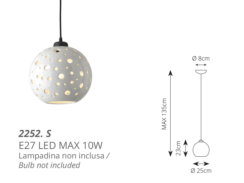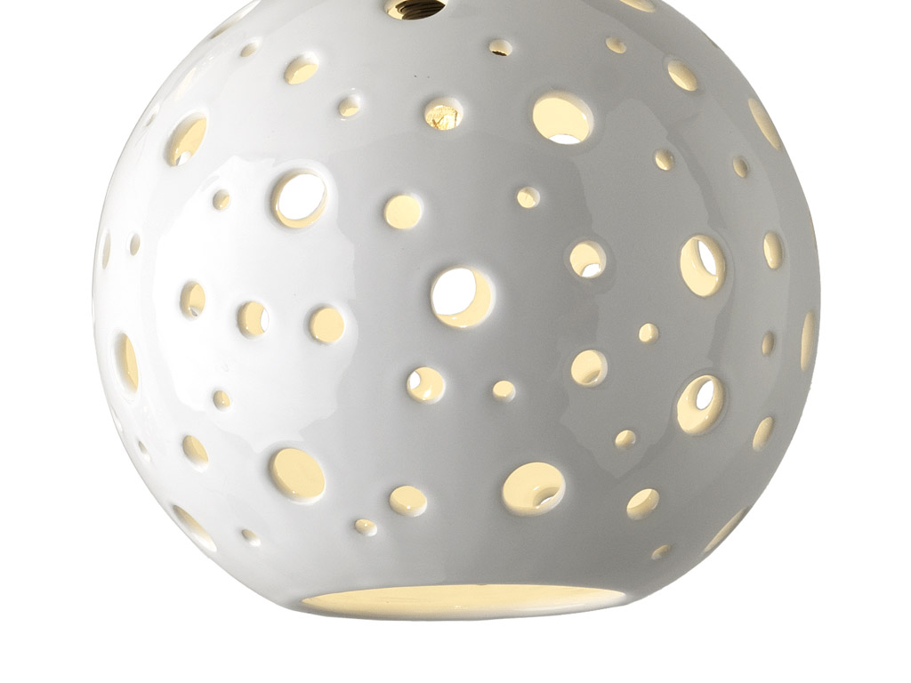 L’abat-jour sphérique en céramique blanche est perforé avec des trous de différentes tailles.