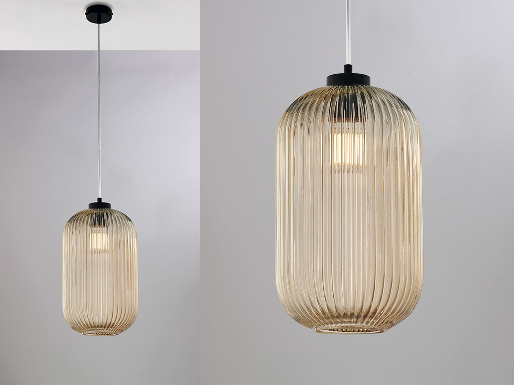 Disponible en trois finitions – Ambre, Gris Miroité et Transparent – elle se distingue par son abat-jour nervuré en relief. Les reflets et transparences créent une lumière chaude et accueillante, idéale pour tout intérieur.