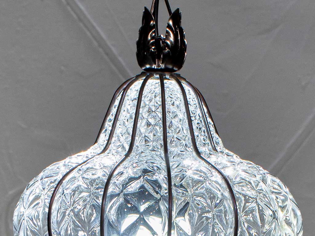 Lampe réalisée en verre soufflé à l’intérieur d’une cage en acier inoxydable, travaillée par des maîtres artisans vénitiens, modèles intemporels dans une combinaison parfaite d’élégance et de raffinement.