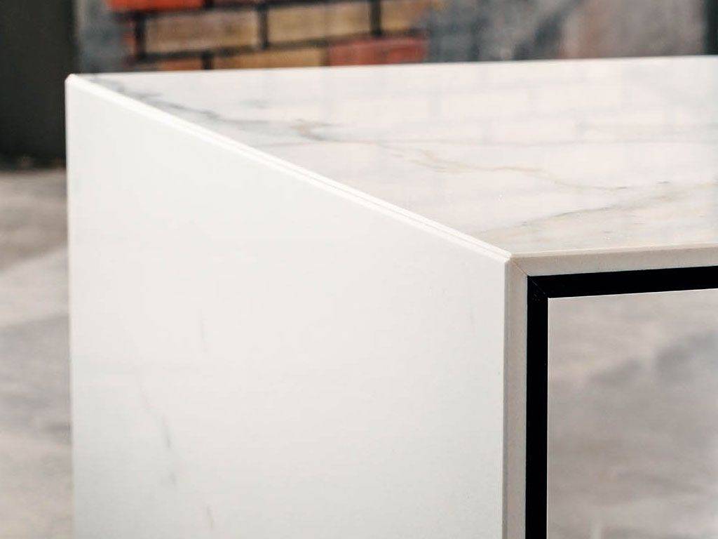 Petite table rectangulaire, meuble tv caracterisé par un revêtement en céramique avec un effet de marbre blanc (il semble au marbre calacatta ou statuaire), la céramique est associée à un verre transparent.