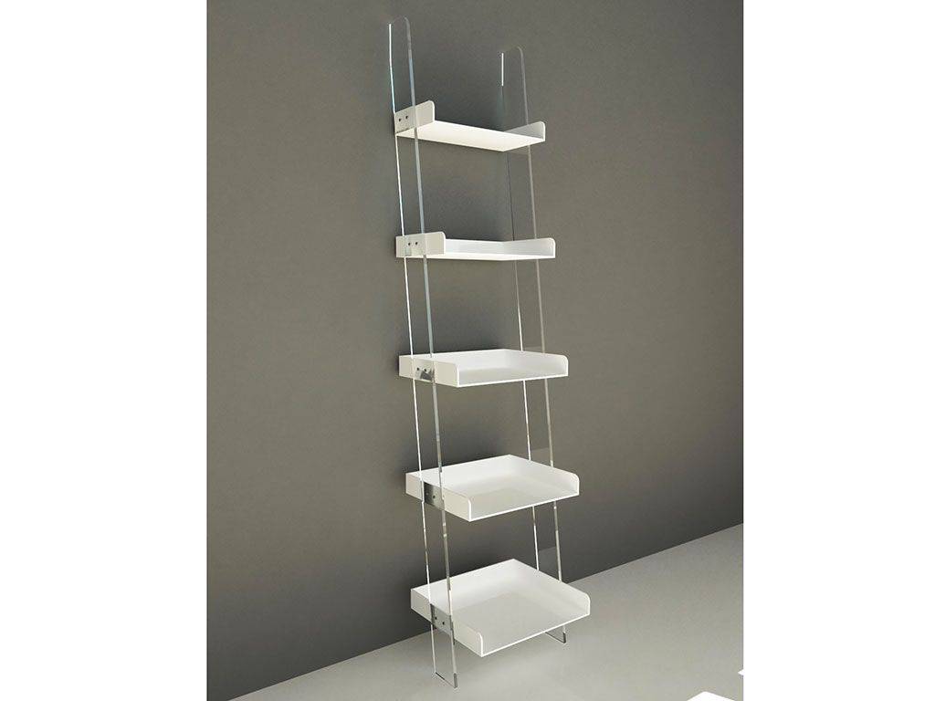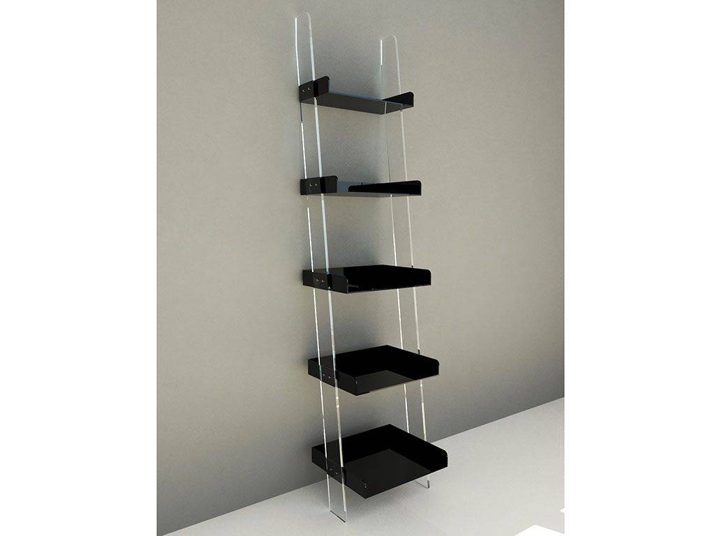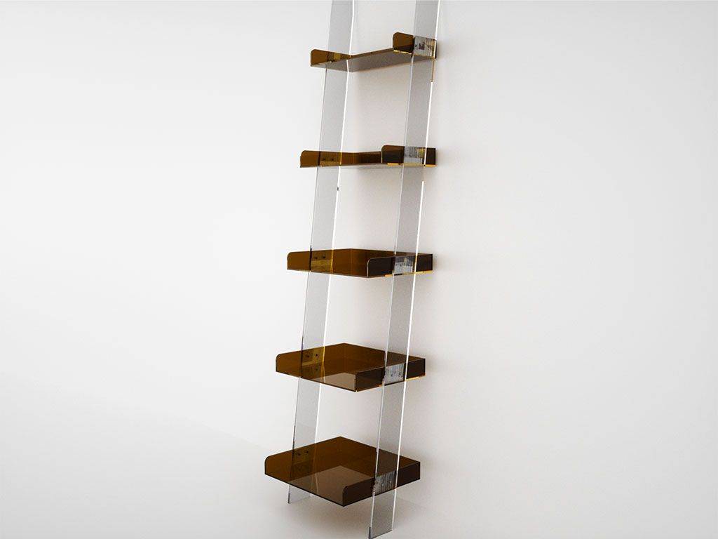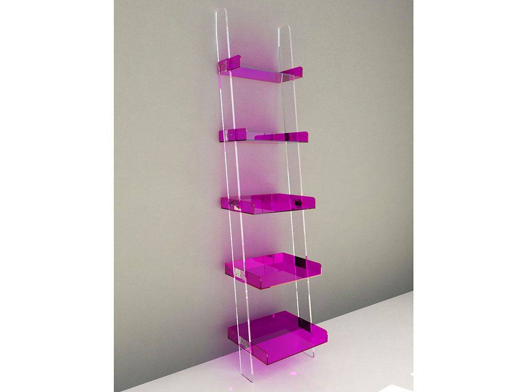 Petit escalier pour la salle de bains avec son style unique et modern. Il y a 5 plateaux. La structure est en plexiglass transparent et les plateaux ont des couleurs différentes aussi.