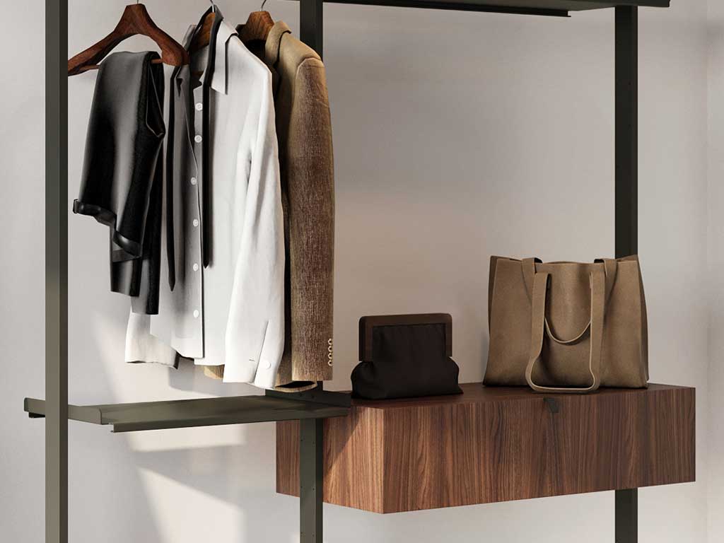 Penderie ouverte au design scandinave moderne, idéale comme penderie d'entrée ou comme dressing dans une chambre à coucher. Systema est une structure modulaire en aluminium avec des montants réglables au sol et au plafond. Il peut également être conçu comme un élément de séparation entre deux pièces, par exemple entre l'entrée et le salon. H 290 cm, avec des pieds réglables de 5 cm au-dessus et au-dessous. Les hauteurs standard H 290 peuvent également être réalisées sur mesure. Composition Dimensions : L 156 (2+60+2+90+2) H 290 P 40 cm Eléments individuels : 3 montants L 6 - P 2 - H 290 cm 3 Tablettes L 60 x 36 cm - Capacité 25 Kg 1 Tringle à linge L 60 - Capacité 25 Kg 2 Tablettes L 90 x 36 cm - Capacité de charge 15 Kg 1 étagère inclinée (pour chaussures), L 90 x 36 cm - Prise en charge 15 Kg 1 tiroir en bois L 90 x 40 H 21,8 cm Finition métal : Noir mat Ral 9005 Gris aluminium Ral 9007 Blanc mat Ral 9010 Finitions bois : Chêne Noyer Canaletto Produit fabriqué en Italie