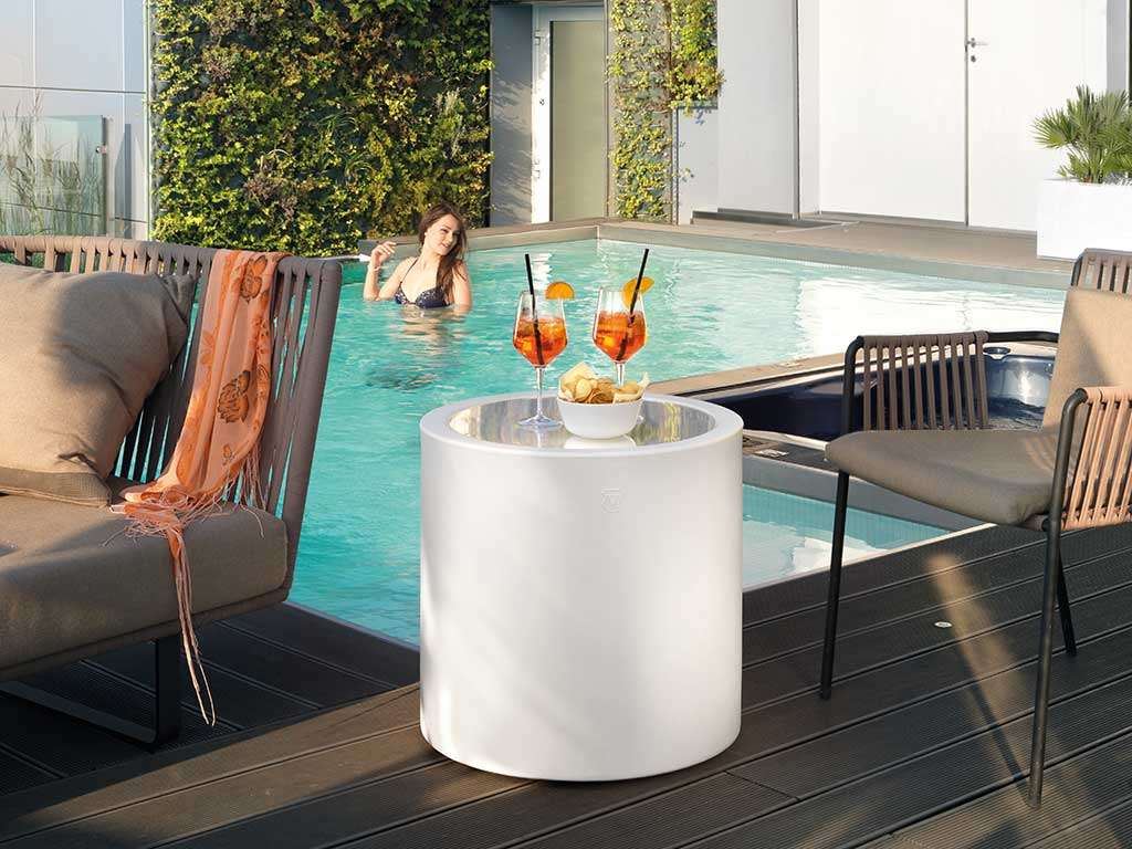 Petite table lumineuse en polyéthylène en forme de cylindre, avec partie supérieure en plexiglas amovible.