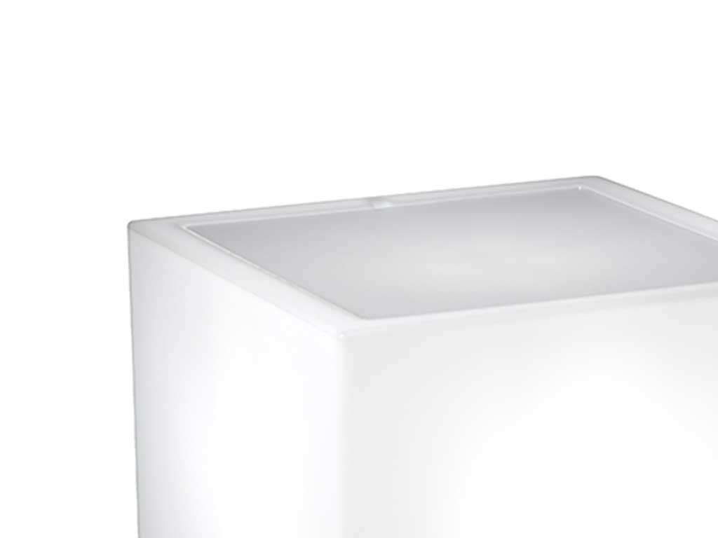 Petite table lumineuse d’extérieur en polyéthylène en forme de cube, avec partie supérieure en plexiglas amovible.
