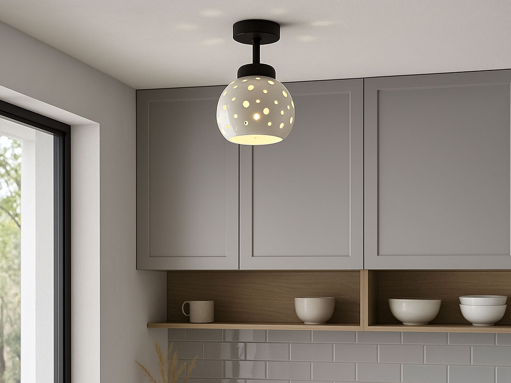 L’abat-jour en céramique Ø 15 cm, percé de petits trous, diffuse une lumière douce et régulière.