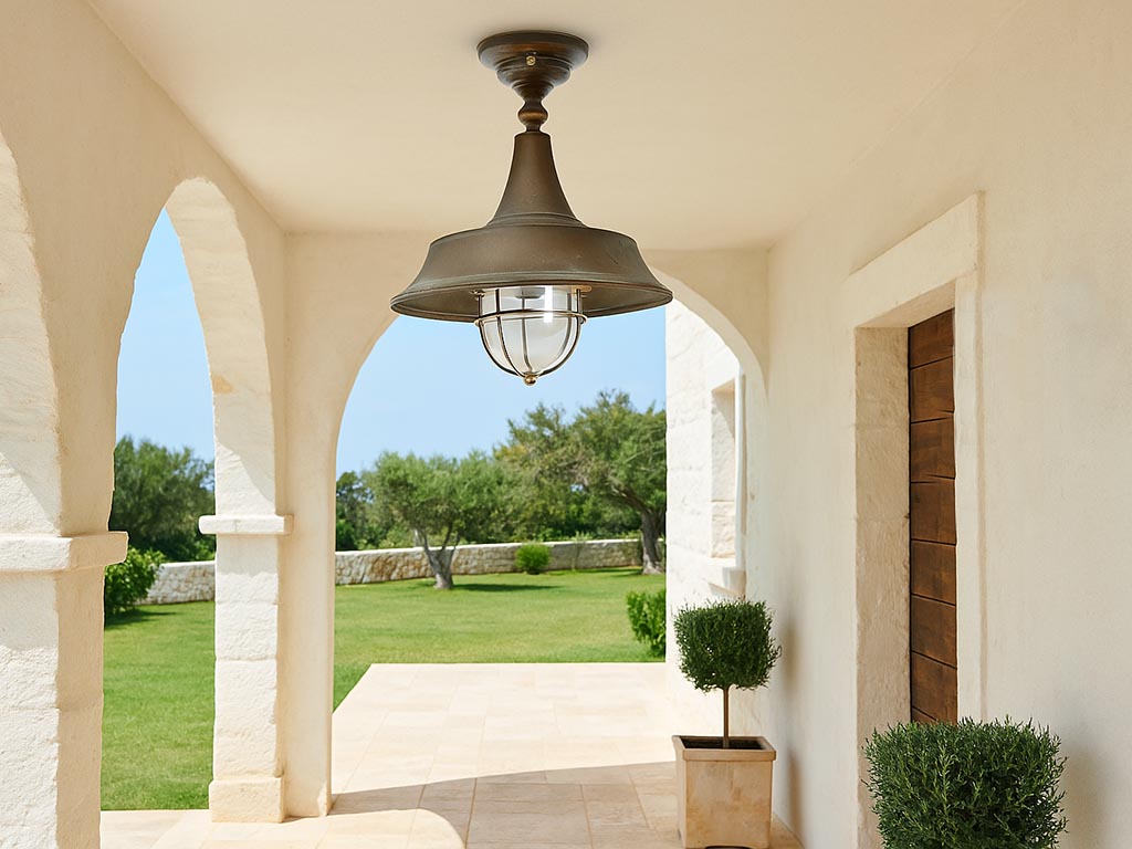 Plafonnier extérieur terrasse, plafonnier laiton, plafonnier vintage, idéale comme lampe pour terasse ou plafonnier extérieur. Lampe en laiton moulé sous pression et plaque. Idéal pour éclairer des lieux vintage comme les anciennes maisons de campagne et des villas, ou pour un ameublement en style vintage ou nautique. Dimensions: H 45 cm – Abat-jour Ø32 – Fixation murale Ø11 cm Verre: Transparent ou Opale Finition: Laiton vieilli cuivré (.AR) Laiton vieilli bruni (.BA) Degré de protection IP44 Dans le douille E27 on peut installer ampoule LED, pour obtenir basse consommation d’énergie. Classe d’éfficacité A+÷E AMPOULE NON INCLUSE. Produit fabriqué en Italie. Le vieillissement de nos produits est fait à la main c’est pourquoi la teinte du laiton pourrait avoir des nuances différentes de celles représentées sur la photographie. Le vieillissement fait à la main n’empêche pas l’oxydation naturelle de ce métal qui, exposé à l’extérieur, est sujet à l’action des conditions naturelles. Nos produits ne sont pas autonettoyants, par conséquent, s’ils viennent à être recouverts de salissure ou autre, il faut les nettoyer avec les produits habituels que l’on utilise pour le nettoyage des métaux. Une fois la procédure de nettoyage effectuée, ils produiront de nouveau au fil du temps la patine typique du vieillissement naturel du laiton. Ce produit est réalisé avec extrême attention aux détails, à la résistance des matériaux et à la qualité des finitions, pour construire chaque fois une pièce unique. Les fabrications sont réalisées par experts artisanales, qui grâce à leur professionnalité, ils sont à la base des produits de qualité Made in Italy.