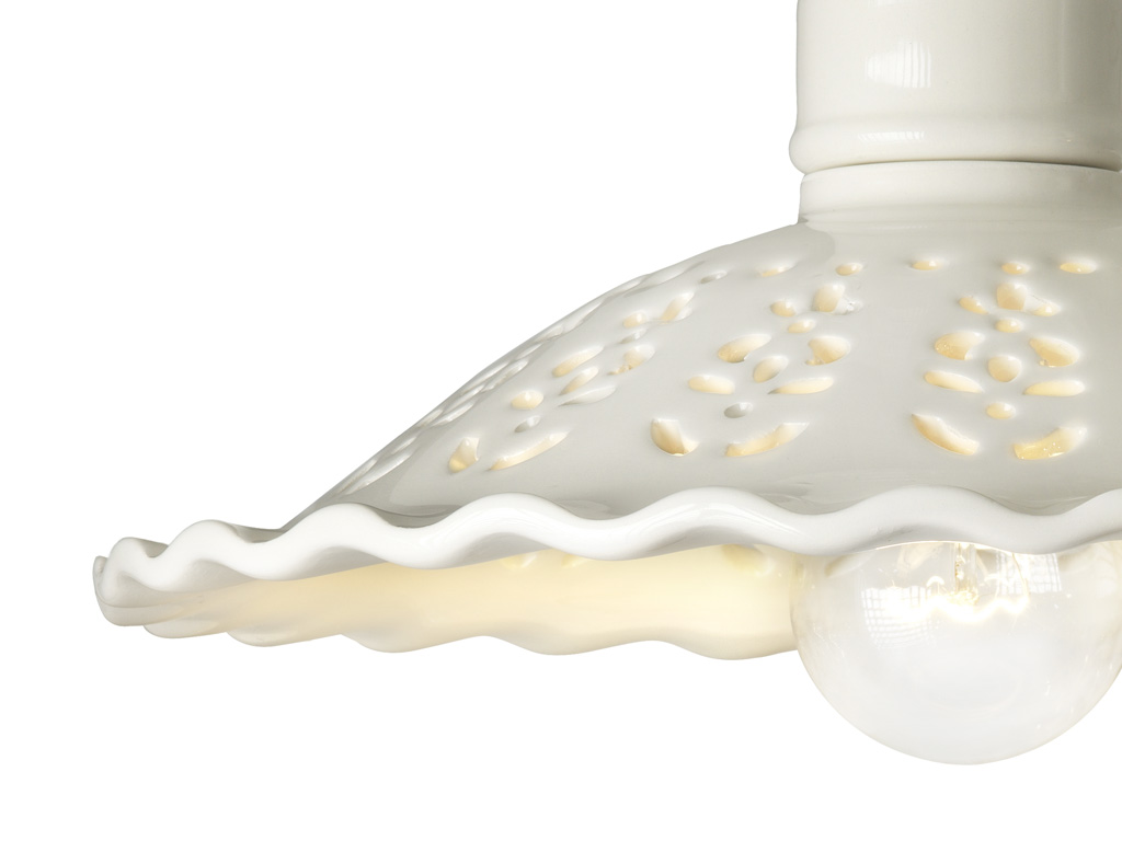 L’abat-jour en céramique a un bord ondulé et des découpes décoratives.