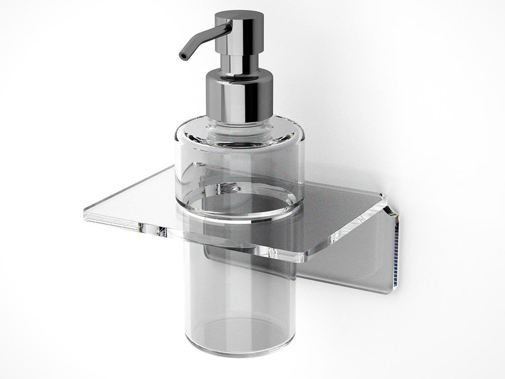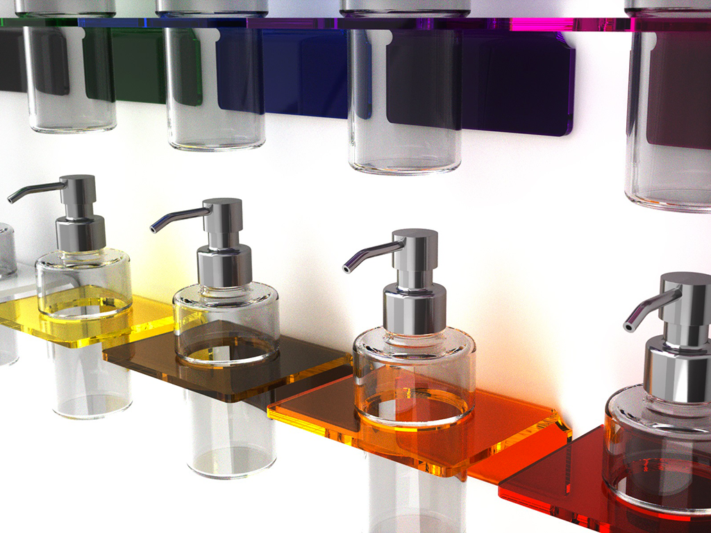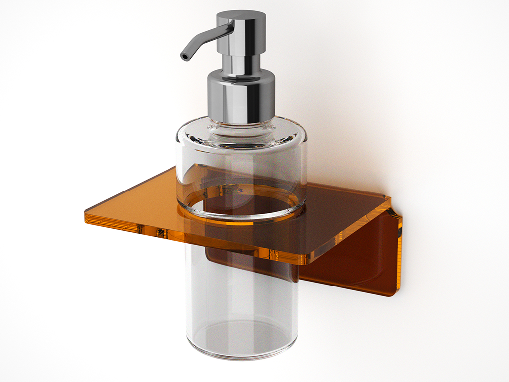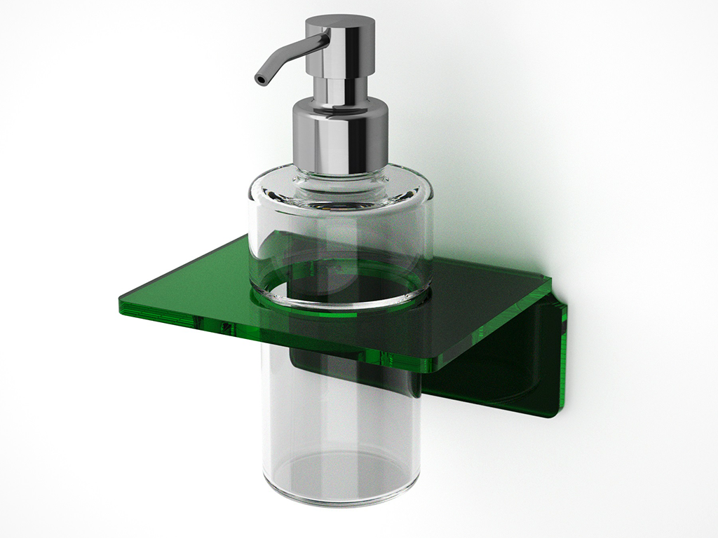 Porte distributeur de savon de design original et moderne en plexiglass coloré courbé à chaud, disponible en deux dimensions de montage, à colle ou à tuiles.