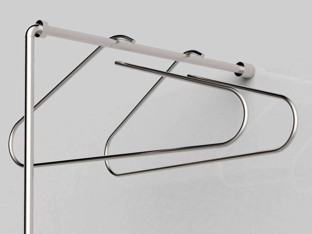 Porte-manteau avec une structure en acier inoxydable et la base en acier verni, caracterisé par un design minimal. Un fil d’acier inoxydable est figé au mur grâce à un élément cylindrique et un barreau en acier verni qui est figé au sol.