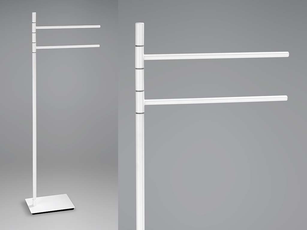Porte-serviettes sur pied, porte-serviettes noir, idéal comme accessoire de salle de bains. Le point fort de ces produits est la fabrication entièrement artisanale, rigoureusement réalisée en Italie. Les matériaux utilisés sont le laiton et l'acier, ce qui garantit l'inaltérabilité du produit dans le temps. Dimensions : L33 x P15 x H90 cm - base L15 x P21 cm Matériaux et finitions : Acier inoxydable 430 - chromé, peint en noir ou en blanc mat. Produit fabriqué en Italie