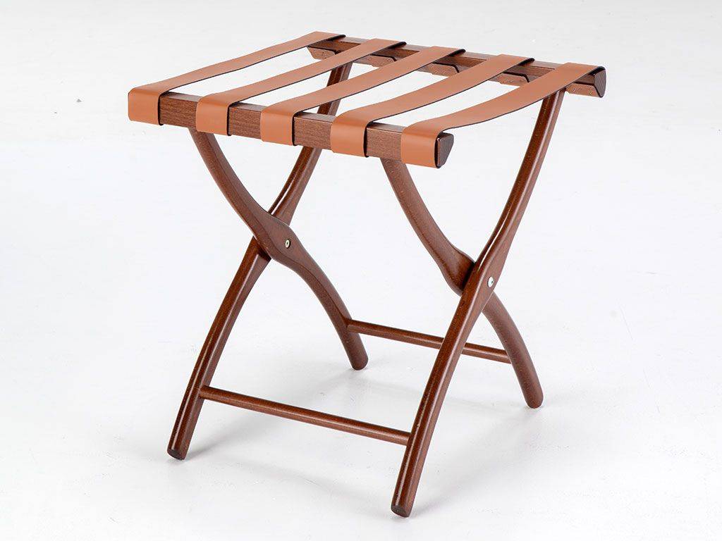 Porte-valise en bois de hêtre naturel ou teinté noyer avec étagère en cuir, structure pliante.