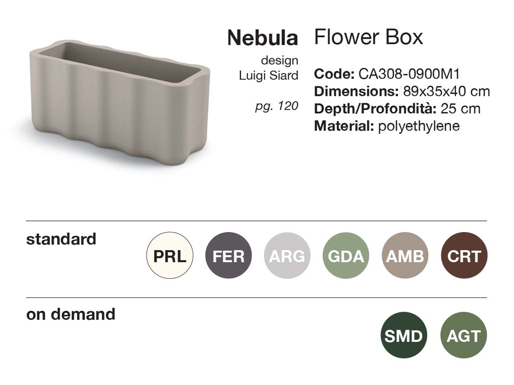 Dimensions: Pot extérieur L 89 X P 35 X H 40 cm, 6,5 kg Pot intérieur L 80 X P 26 X H 25 cm Si vous souhaitez acheter ce produit dans l'une des finitions du nuancier ON DEMAND, veuillez noter que la commande est uniquement possible par multiples de 4 pièces : pour procéder, envoyez-nous une demande de devis à info@infabbrica.com