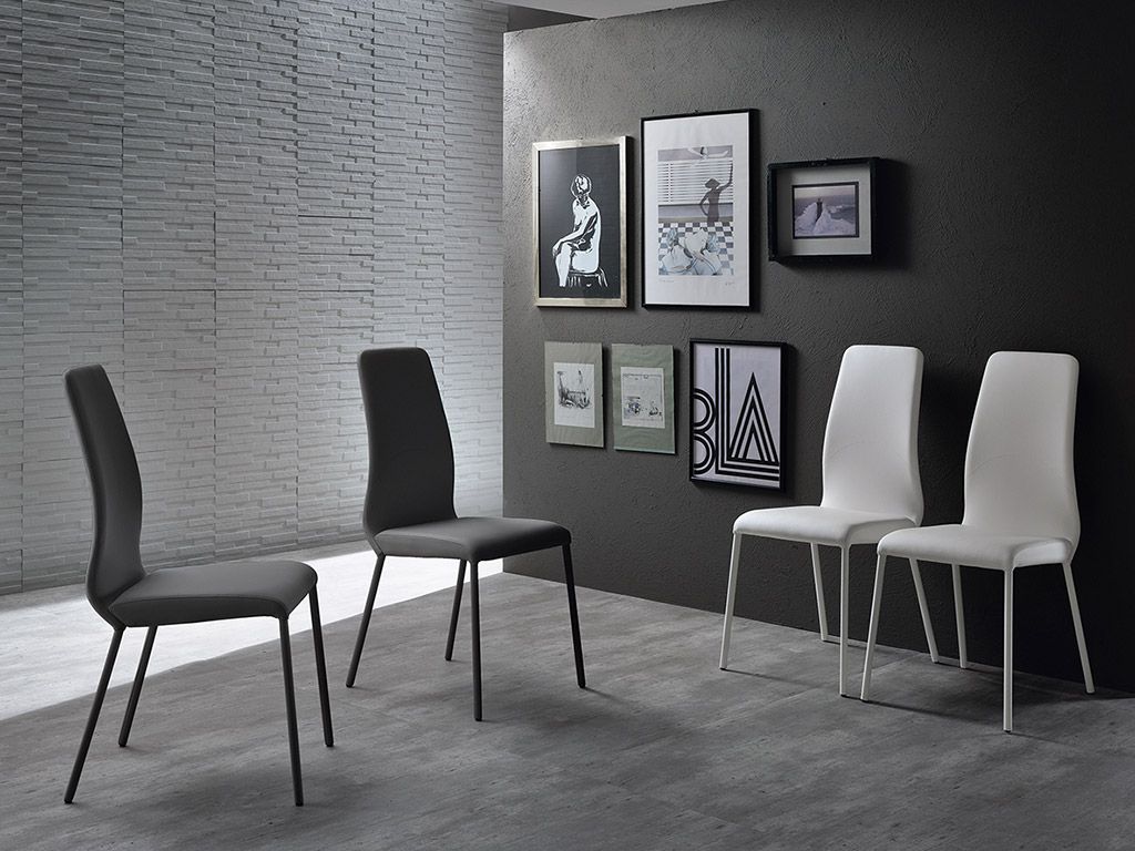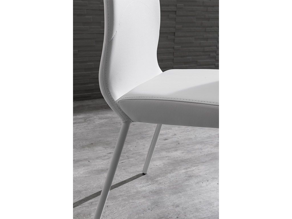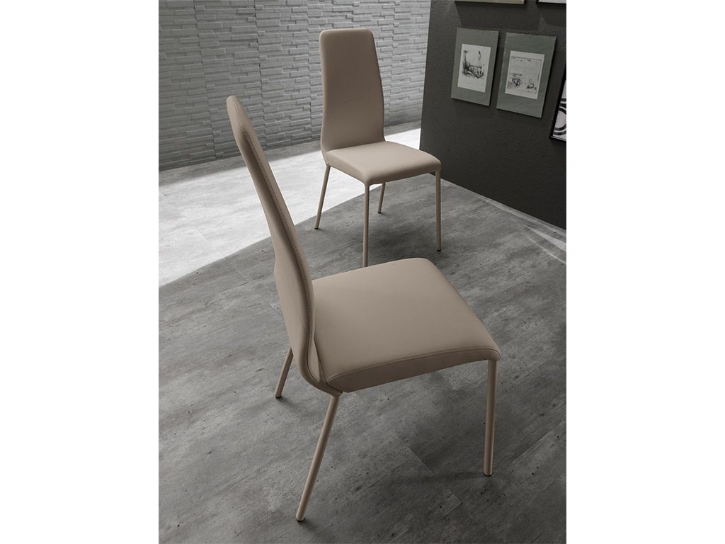 Chaise avec structure en métal, assise et dossier rembourrées en faux cuir disponible en différentes couleurs. Pieds laqués combinés.