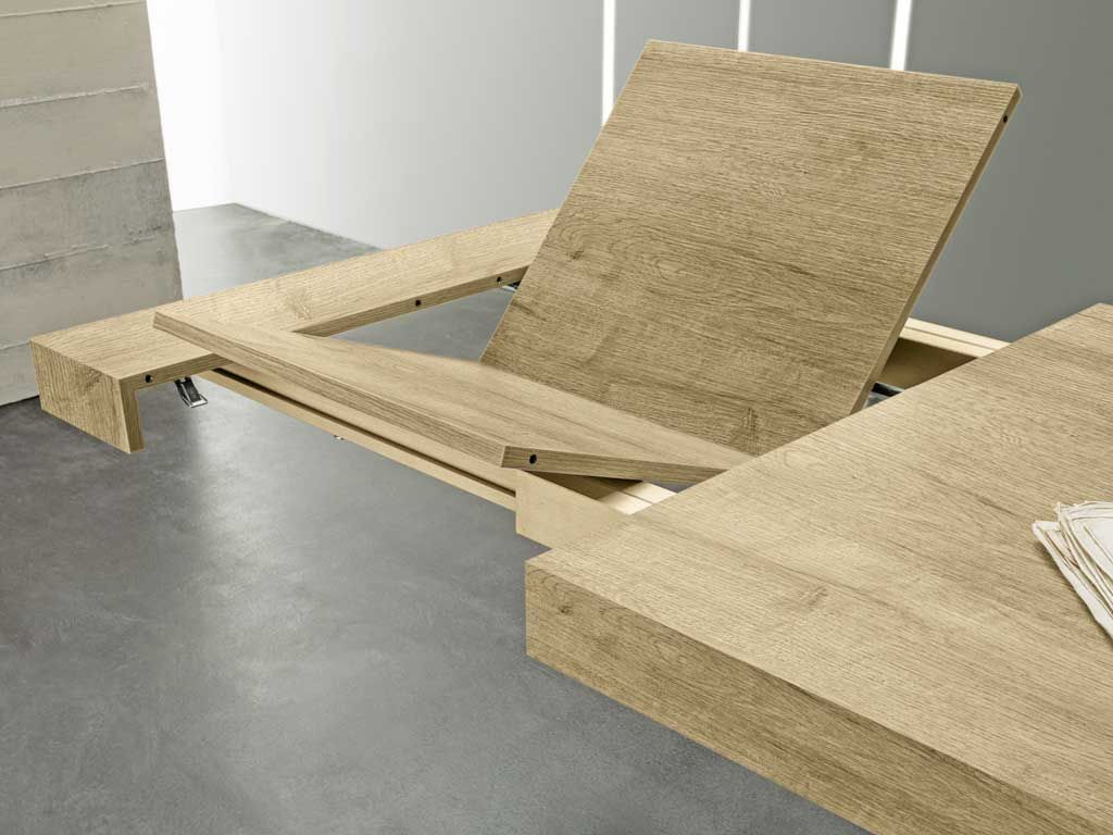 Table à rallonges avec base en mélamine noir mat, plateau et rallonges en mélamine avec bord de 8 cm disponible en plusieurs finitions.