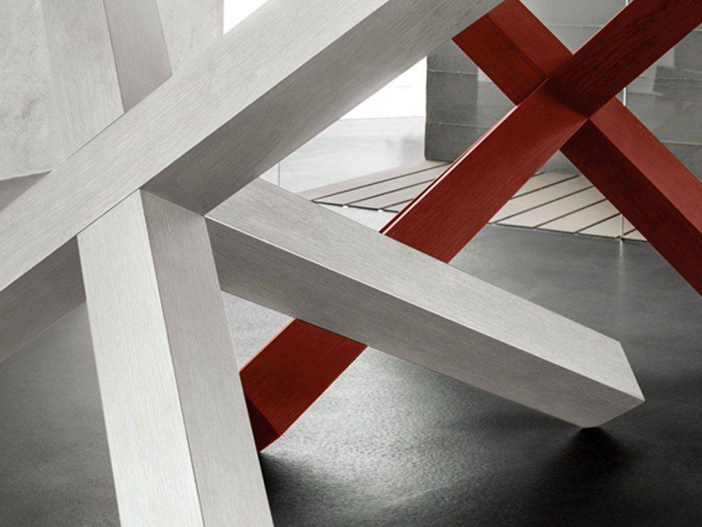 Table fixe au design moderne, avec base aux deux pieds crossés en bois massif de chêne verni, ou laqué et avec plateau en verre transparent. La table est disponible en plus versions, avec les pieds unicolore ou bicolore.