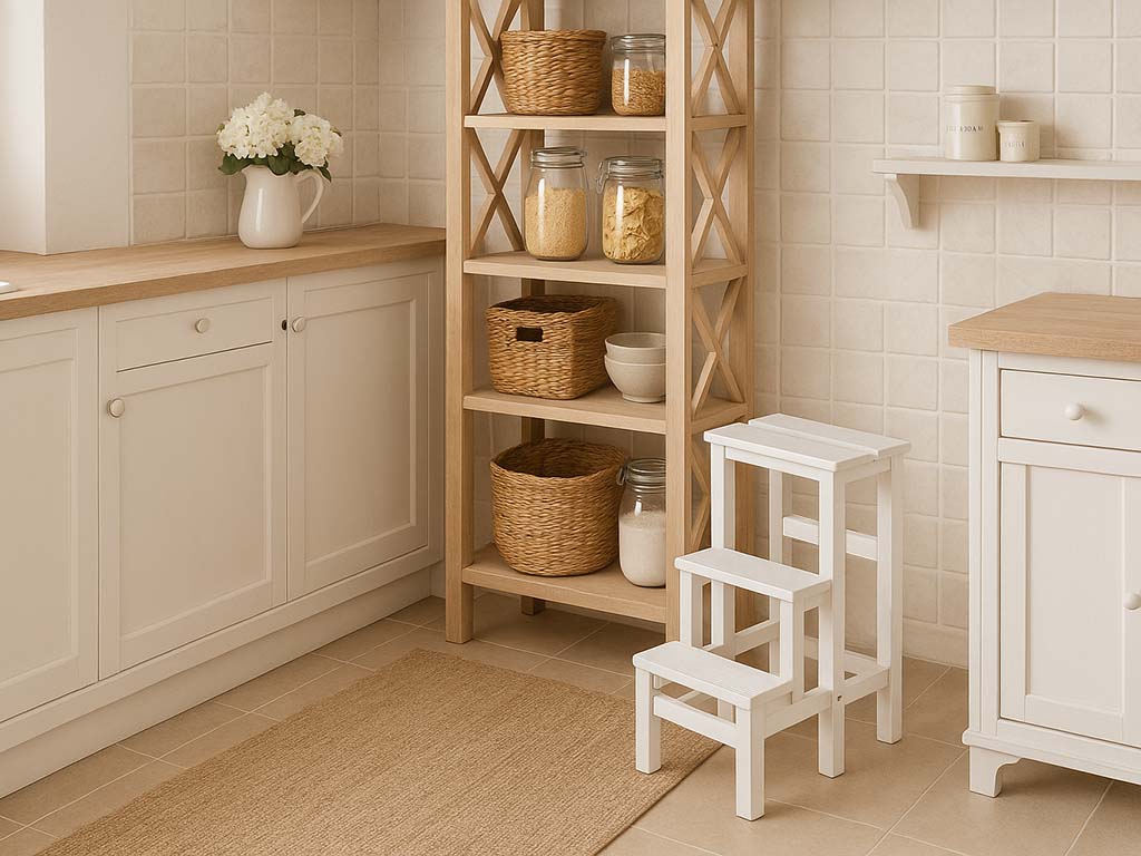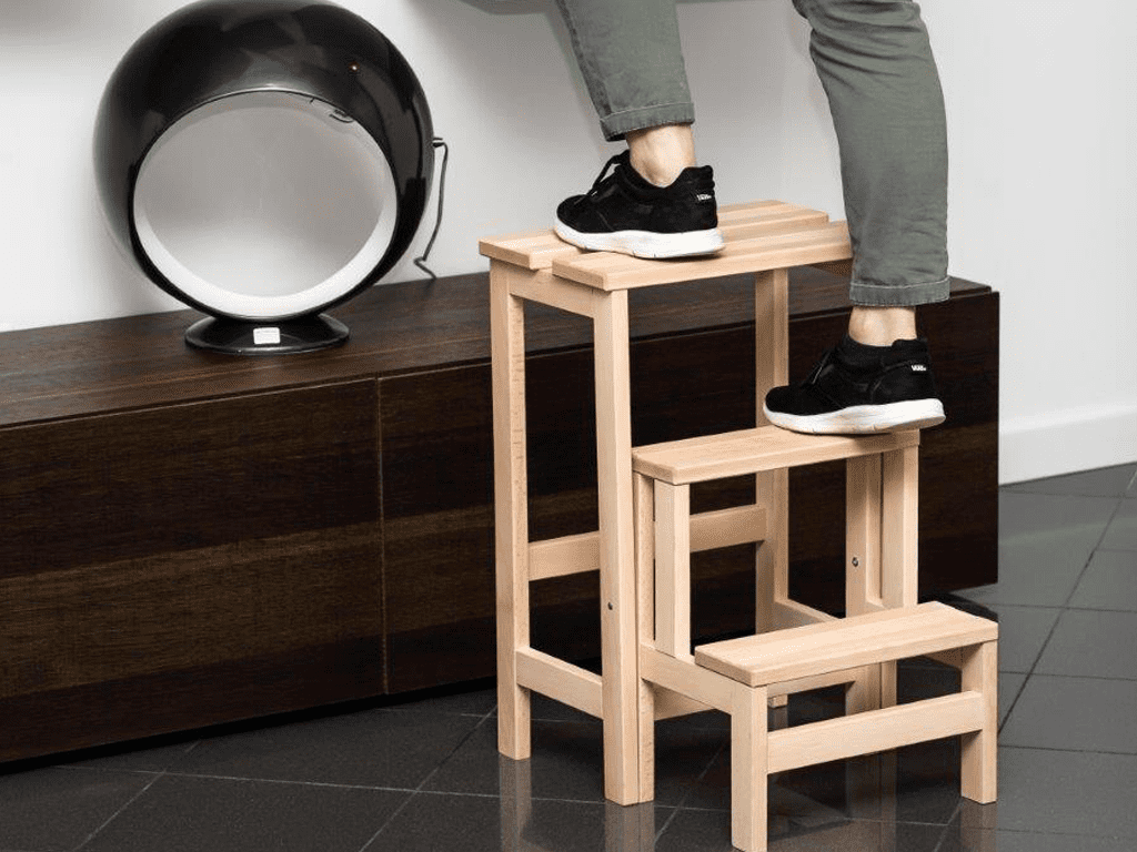Tabouret-échelle en bois, grâce à 2 marches tournants peut être utilisé aussi comme une échelle solide, c’est multifonctionnel.