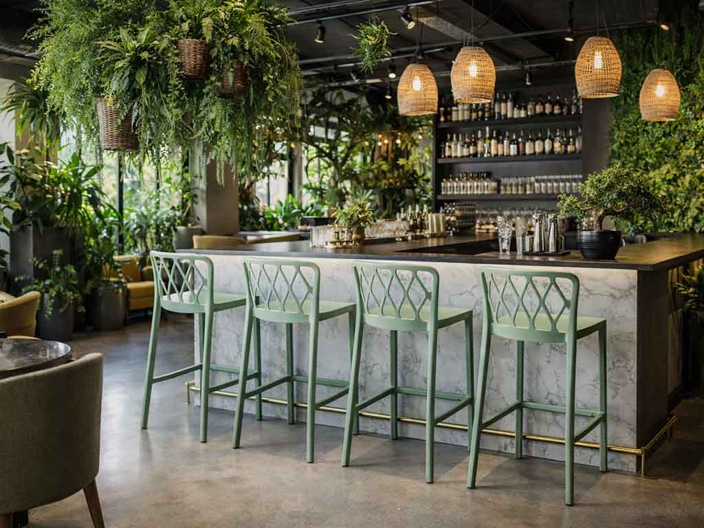 Les tabourets modernes représentent une solution d’aménagement de plus en plus appréciée dans les espaces contemporains, en particulier dans les bars, restaurants, comptoirs snack et environnements contract. Ce tabouret avec une hauteur d’assise de 75 cm se distingue par son design élégant et reconnaissable, dans lequel le dossier tressé à motif géométrique devient le véritable élément central, apportant légèreté visuelle et fort impact décoratif.